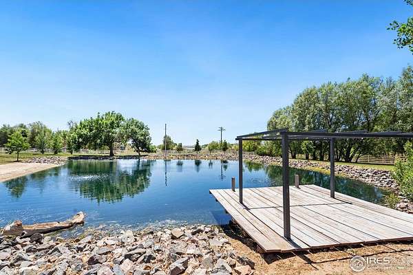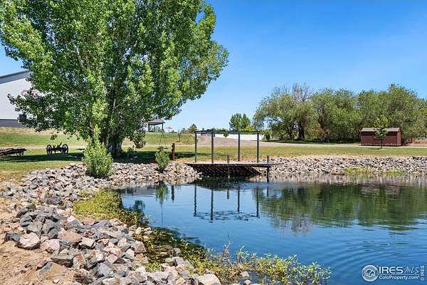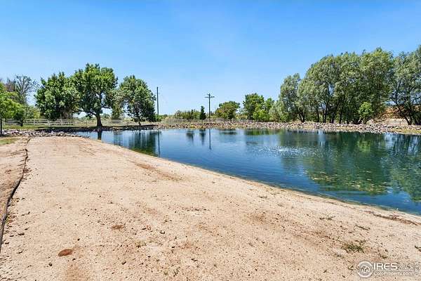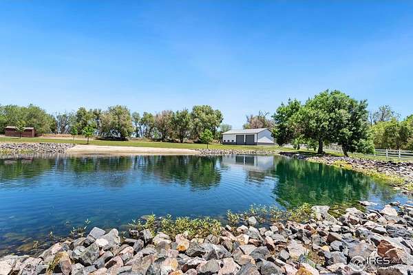 Rare opportunity to own 2.3 acres with premier I-25 frontage and exceptional access, all while maintaining an impressive level of privacy. Mature trees and natural landscaping create a secluded setting that feels far removed from the road, offering a unique blend of visibility, convenience, and tranquility. The property features a 3/4-acre stocked pond complete with a dock and sandy beach, providing an ideal space for fishing, relaxing, or enjoying outdoor gatherings. The pond and surrounding grounds create a peaceful, park-like environment well suited for recreational use or future vision. A recently constructed 40' x 60' shop offers outstanding utility and flexibility. The building includes two 14' x 14' overhead doors, an additional 10' x 12' overhead door, and a large extended concrete pad, allowing for easy access and storage of vehicles, equipment, trailers, or recreational toys. The sale includes 1.5 shares of Lake Canal water rights, adding long-term value. Icing on the cake? It's zoned RPD so there are many uses available! This versatile property is ideal for a weekend retreat, recreational use, or an accessible storage and use site with quick connectivity to Northern Colorado communities. With its rare combination of frontage, privacy, water features, and infrastructure already in place, this property presents a unique opportunity in an increasingly limited market.