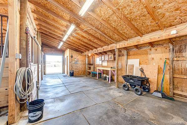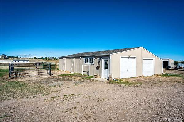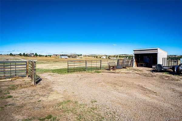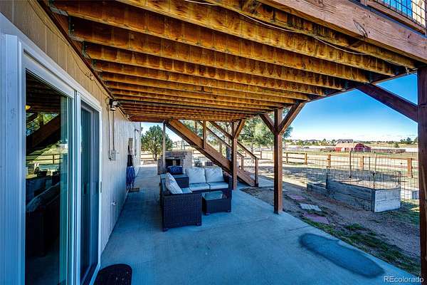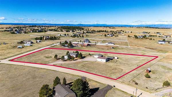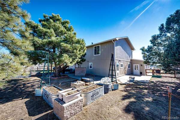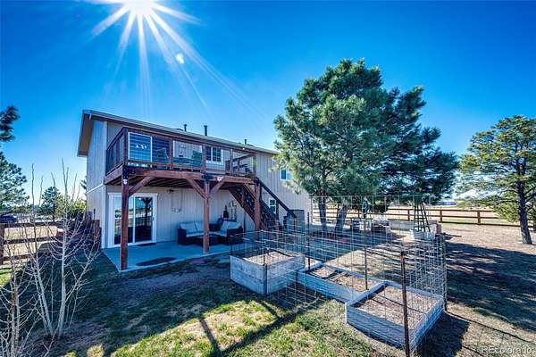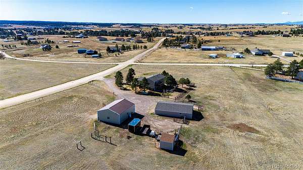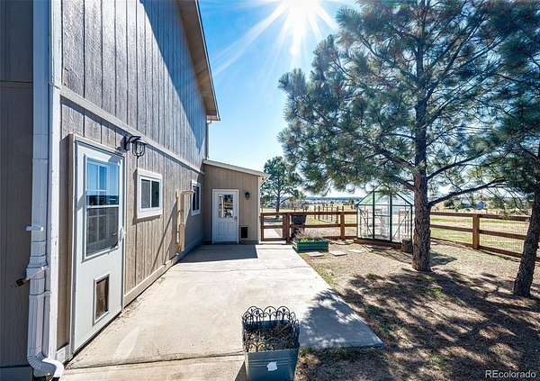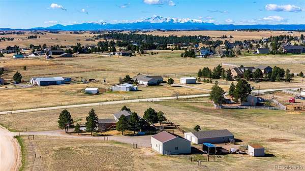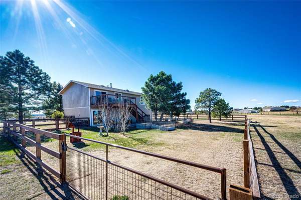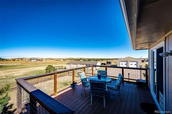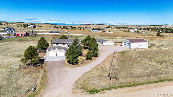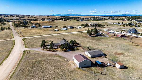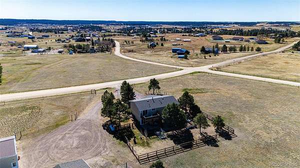 An Exceptional Colorado Residence on 5 Private Acres in Cimarron. Set in the highly sought-after Cimarron community—featuring riding bridle paths, open space, and just minutes from Elizabeth—this beautifully updated 4-bedroom, 3-bath home offers refined country living with stunning mountain views right from your backyard. The main level includes 3 bedrooms and 2 updated baths, highlighted by a primary suite with a custom-tiled walk-in shower. Enjoy new LVP flooring and a remodeled kitchen with granite countertops, maple cabinetry, high-end appliances, and a stainless-steel island. A new sliding glass door opens to a spacious composite deck—perfect for entertaining and Colorado sunsets. The walkout lower level features a large family room with pellet stove, office area, mudroom with backyard access, and a private 4th bedroom with walk-in closet and ¾ bath. A second sliding glass door leads to a covered patio with hot tub-ready 220V service and backup generator hookup. The oversized insulated 2-car garage accommodates full-size trucks and offers backyard access. Backyard highlights include cedar 3-rail fencing with no-climb wire, gated entry, greenhouse, raised garden beds, propane fire pit, and multiple outdoor living areas. Major upgrades include new roof (home & barn), exterior paint, front deck, furnace, water filtration system, electrical updates, newer water heater and pressure tank, new lower-level windows and carpet, and updated smoke/CO detectors—truly move-in ready. The 30’ x 40’ workshop features fiber internet, 220V service, welding/compressor circuits, radiant heat, owned 100-gallon propane tank, and LED lighting. Equestrian-ready with a 30x48 barn, 2 box stalls, heated waterer, tack/hay storage, pipe corrals, lean-to shelter, and prepped riding arena. Fully fenced and cross-fenced. A rare blend of space, function, and Colorado lifestyle—schedule your private showing today.