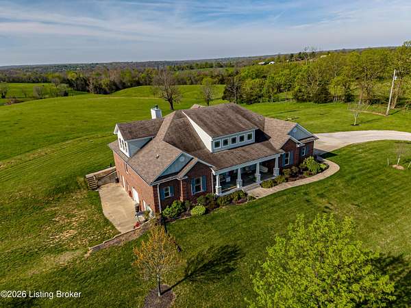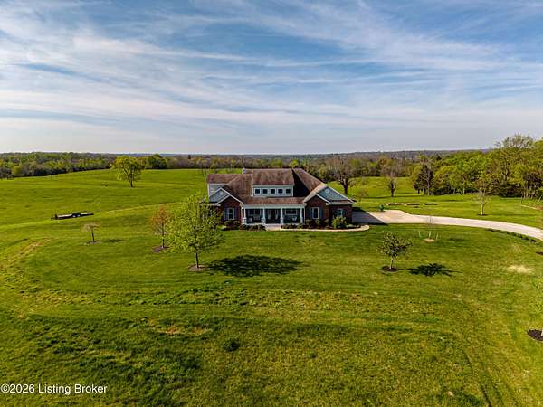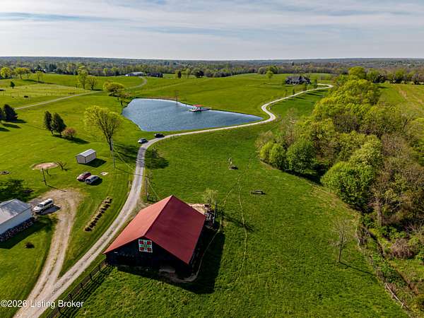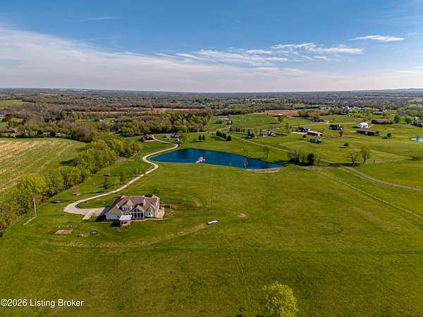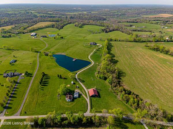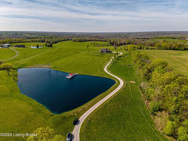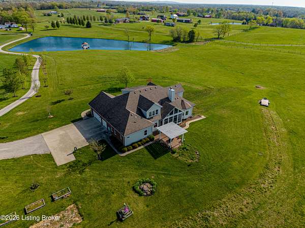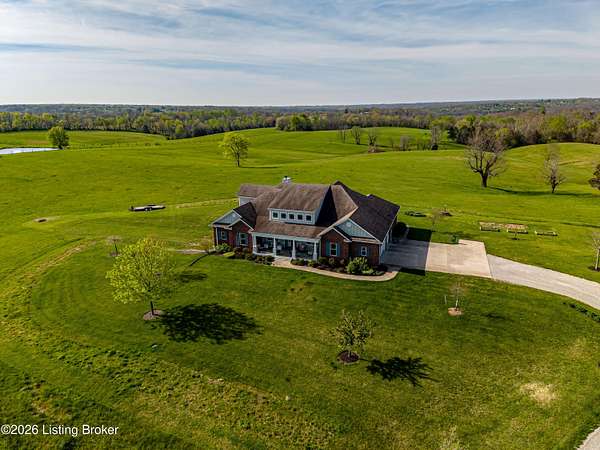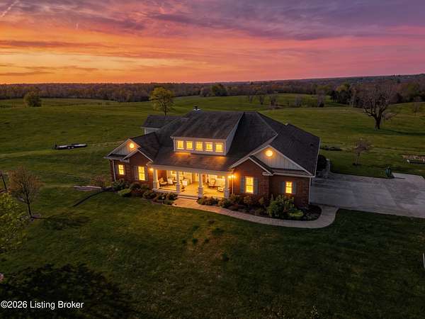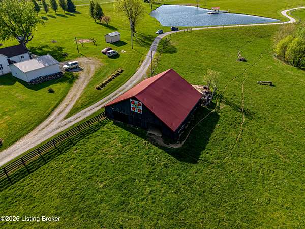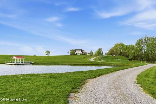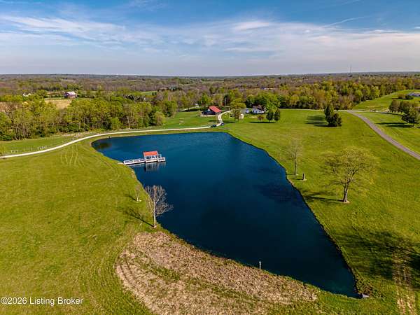 Welcome Home -where peaceful country living meets modern comfort on this stunning 58.35-acre homestead. With breathtaking views, rolling green pastures, wildflowers, and a serene water view from the front porch, this property truly feels like your own private retreat. The land offers a perfect balance of open space and privacy, including 6 wooded acres and a picturesque 2-acre stocked pond filled with largemouth bass and catfish. Enjoy quiet evenings on the covered dock with a good book, or start your mornings on the back porch listening to birdsong as the day begins. Inside, this spacious home features 6 bedrooms and 4 baths, thoughtfully designed for both everyday living and entertaining. The beautiful dining room provides the perfect setting for gatherings, while the expansive kitchen is a true standout-complete with granite countertops, a dedicated baking center, a large pantry with custom doors, a self-opening trash can, and incredible storage with 34 doors and 26 drawers. The impressive family room showcases soaring 21-foot ceilings, exposed wood beams, and a stunning wood-burning fireplace with creekstone detail. A screened-in sunroom, accessible from the primary suite, offers a peaceful space to unwind year-round. Functionality meets convenience with a laundry room located just off the primary closet, and a well-designed mudroom featuring unique custom doors that add both charm and character. Car enthusiasts and hobbyists will appreciate the 5-car garage with UTV space, a dedicated woodworking shop, and a versatile barn with three sections-complete with water and electricity. Additional highlights include: New roof (2024) on barn, Energy-efficient geothermal heating and cooling with 3 zones, Abundant attic space for storage, HERS score of 55 (see documents) and so much more. This one-of-a-kind property offers the perfect blend of tranquility, craftsmanship, and modern efficiency-your dream homestead awaits.