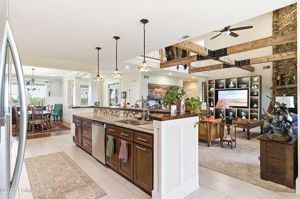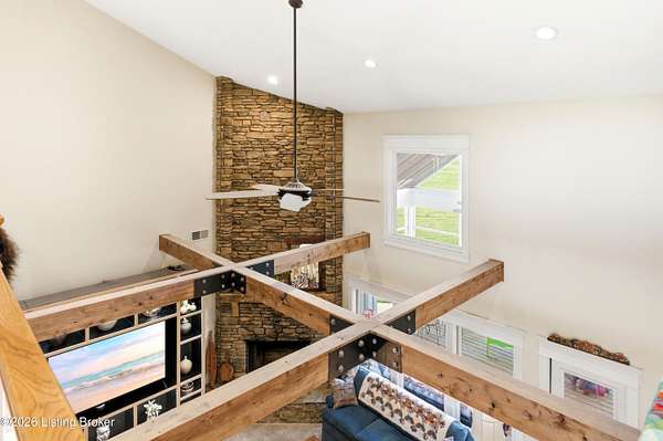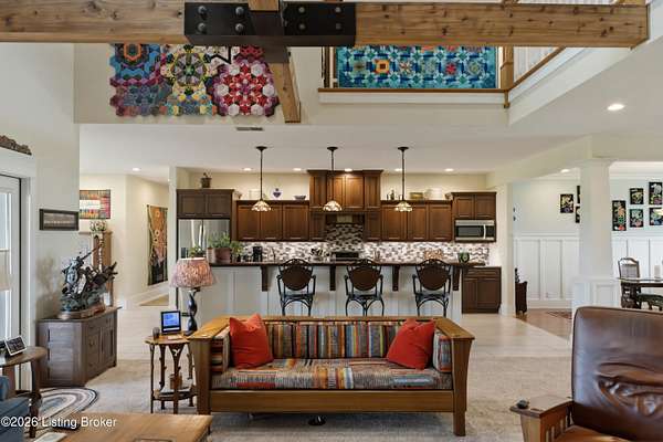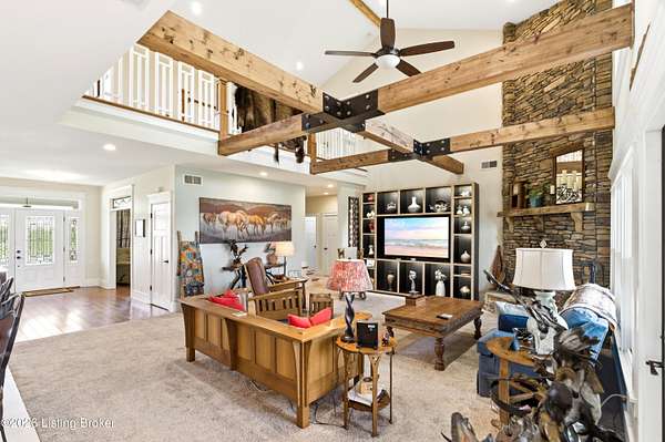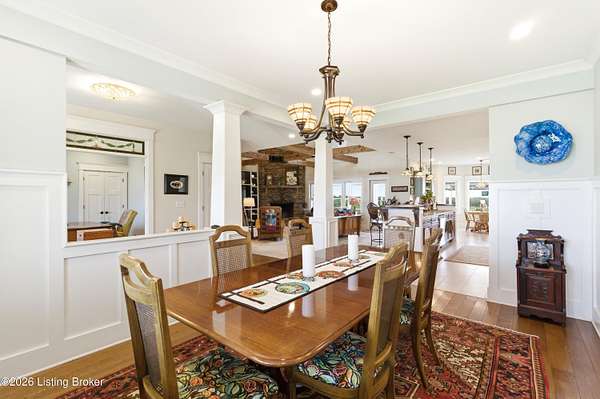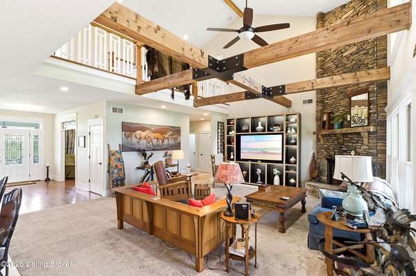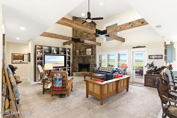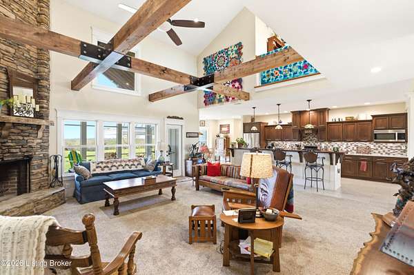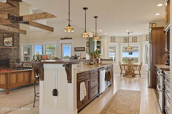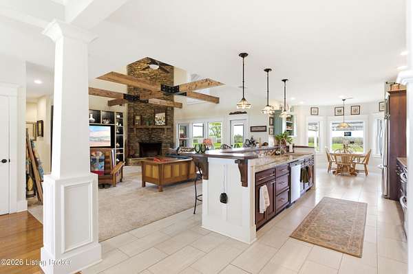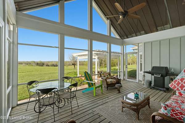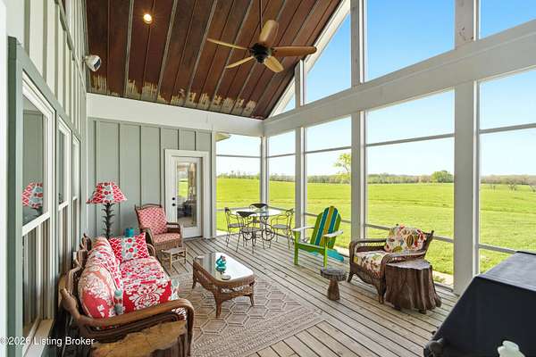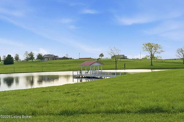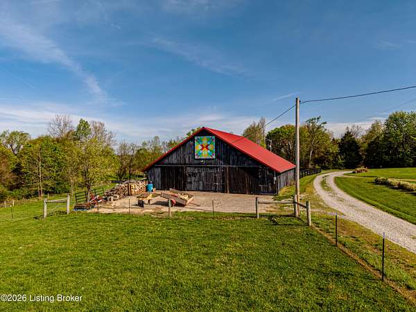 Welcome Home -where peaceful country living meets modern comfort on this stunning 58.35-acre homestead. With breathtaking views, rolling green pastures, wildflowers, and a serene water view from the front porch, this property truly feels like your own private retreat. The land offers a perfect balance of open space and privacy, including 6 wooded acres and a picturesque 2-acre stocked pond filled with largemouth bass and catfish. Enjoy quiet evenings on the covered dock with a good book, or start your mornings on the back porch listening to birdsong as the day begins. Inside, this spacious home features 6 bedrooms and 4 baths, thoughtfully designed for both everyday living and entertaining. The beautiful dining room provides the perfect setting for gatherings, while the expansive kitchen is a true standout-complete with granite countertops, a dedicated baking center, a large pantry with custom doors, a self-opening trash can, and incredible storage with 34 doors and 26 drawers. The impressive family room showcases soaring 21-foot ceilings, exposed wood beams, and a stunning wood-burning fireplace with creekstone detail. A screened-in sunroom, accessible from the primary suite, offers a peaceful space to unwind year-round. Functionality meets convenience with a laundry room located just off the primary closet, and a well-designed mudroom featuring unique custom doors that add both charm and character. Car enthusiasts and hobbyists will appreciate the 5-car garage with UTV space, a dedicated woodworking shop, and a versatile barn with three sections-complete with water and electricity. Additional highlights include: New roof (2024) on barn, Energy-efficient geothermal heating and cooling with 3 zones, Abundant attic space for storage, HERS score of 55 (see documents) and so much more. This one-of-a-kind property offers the perfect blend of tranquility, craftsmanship, and modern efficiency-your dream homestead awaits.