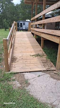 A front covered porch 19 X 13 built in 2025 with stairs and handicap ramp for quiet morning coffee or BBQs.