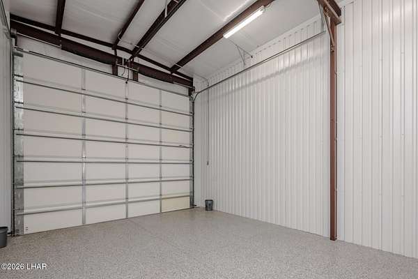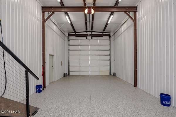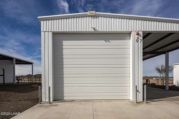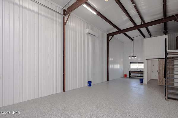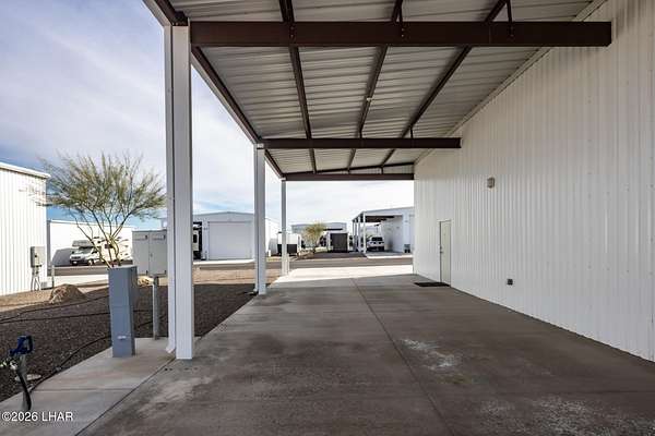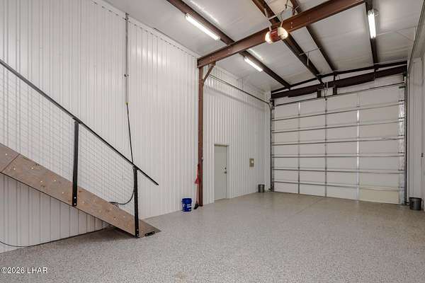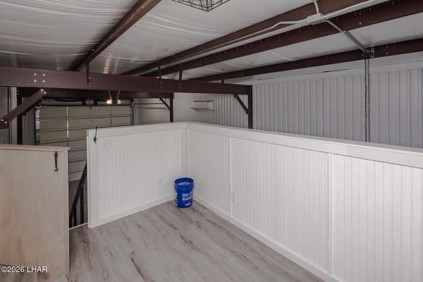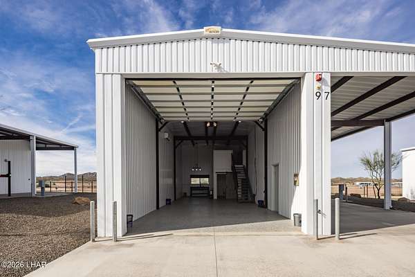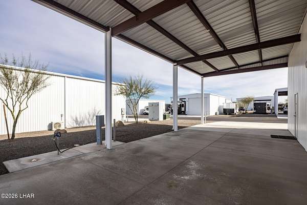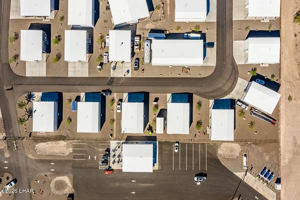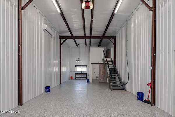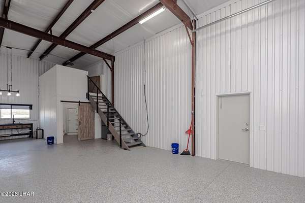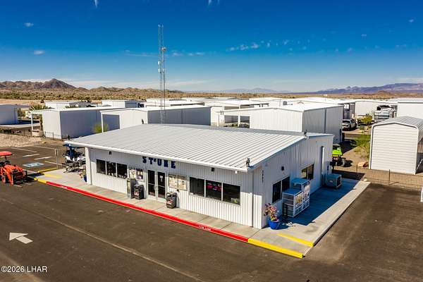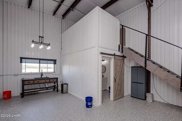 Riverbound Custom Storage & RV Park offers an array of amenities, including a general store, laundromat, pull-through wash station, propane, and fuel station. Each RV Park Site measures 75'x75' and features individual utility pedestals with full hook-up provisions and individual sewage runoff, accommodating all RV and camper classes. Guests can enjoy a swimming pool and spa, restrooms and showers, a golf driving range, pickleball court, basketball court, kids' park, and dog exercise area. Interior features include corrugated metal wall liners, a 3/4 bath with a vanity, custom lighting, and a rear window overlooking the golf driving range. The kitchen area includes a stainless steel refrigerator, a farmhouse sink with ample countertop space, and a wooden farmhouse-style mezzanine with stairs and a metal handrail. Sleeping accommodations feature a queen bed with mattress and headboard. Entertainment and relaxation are elevated with two flat-screen TVs, a coffee table, and two leather couches.