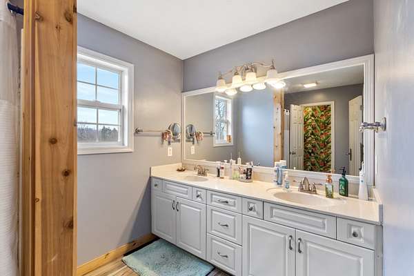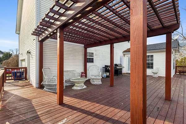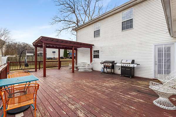 Upstairs includes a spacious loft, a primary suite with two separate closets, double vanity, and walk-in shower, plus three additional large bedrooms and a full bathroom. Outside, enjoy a huge back deck overlooking a half-acre lot with no backyard neighbors. Additional highlights include a front patio and two-car garage.