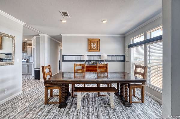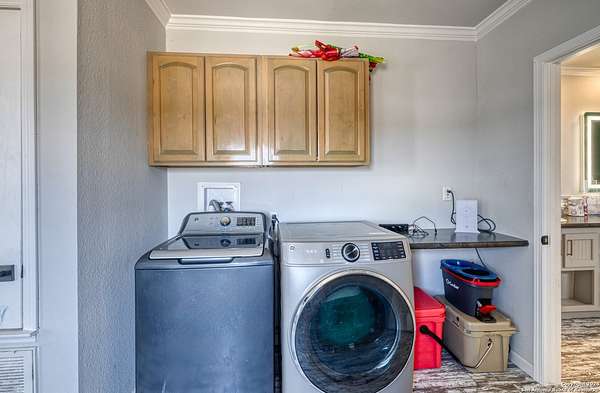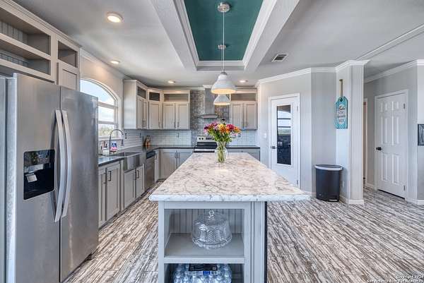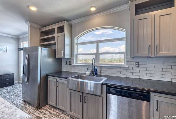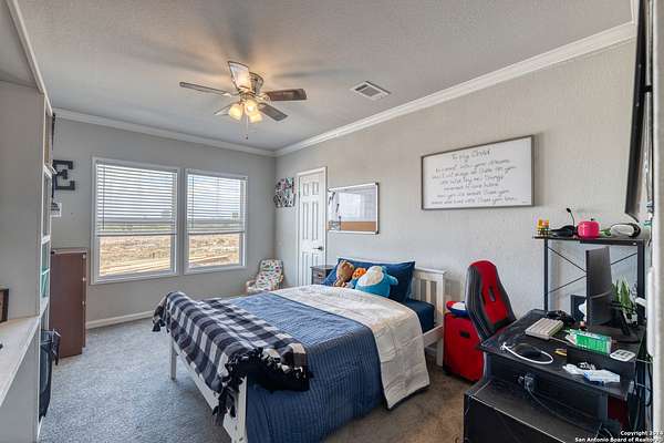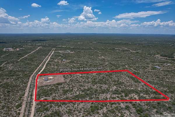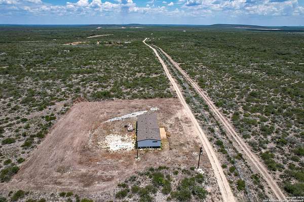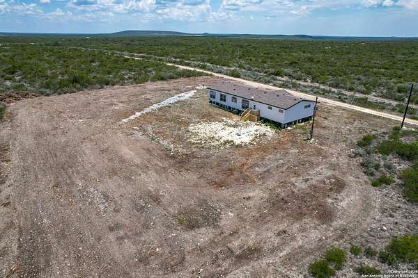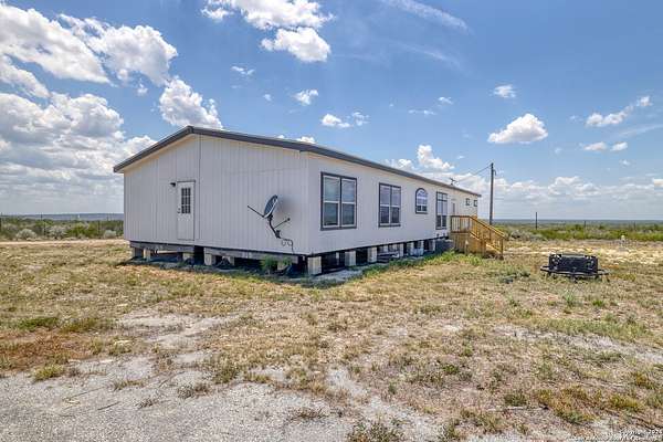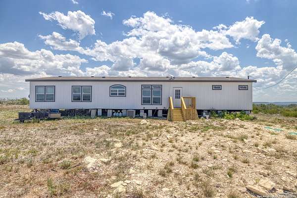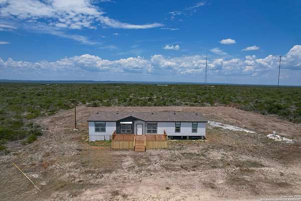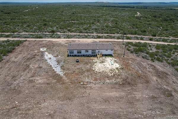 Country living! This immaculate, 2021 Palm Harbor home sits atop a hill with stunning views from the front porch. Situated down a County maintained, caliche road and offering just under 10 acres for the new owner to enjoy how they please. Private well and septic system installed in 2021. This is not your average manufactured home! Equipped with upgrades such as fully finished and textured sheetrock in every room, huge kitchen island, coffee bar area, recessed lighting, coffered ceilings, electric fireplace and crown moldings throughout. With 4 guest bedrooms on one side, and a master suite with marble look shower and glass division, there is ample room for even the largest of families. Just a 15 minute drive to HEB, but with a secluded country vibe. Hunting allowed.