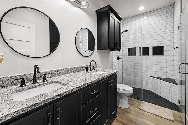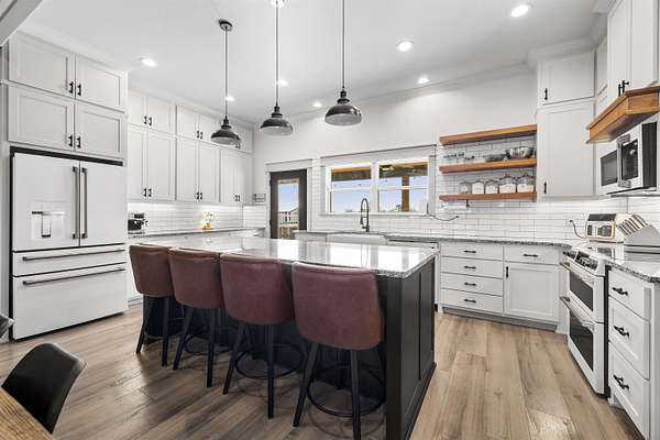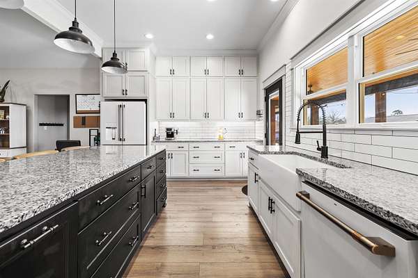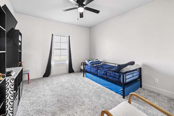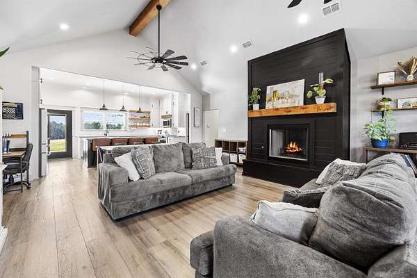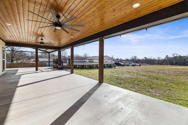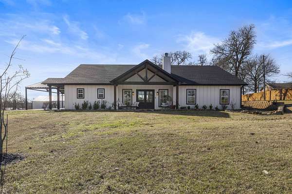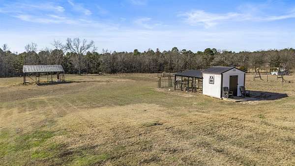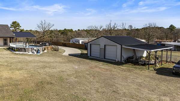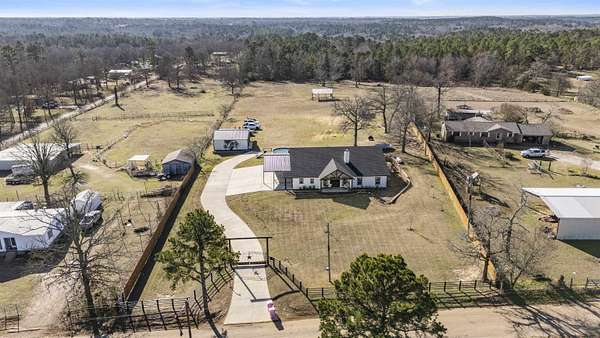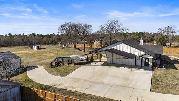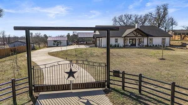 Modern farmhouse on land with all the country living perks. This nearly new 5 bedroom, 3.5 bath home sits on approximately 6.62 fully fenced acres with a pool, a 30 by 30 insulated shop, a chicken coop and wide open space. The home also features two primary suites, each with its own private en suite bath. Inside, you will love the open concept living room with a vaulted ceiling, wood burning fireplace with gas starter and durable luxury vinyl plank flooring. The kitchen features an 8 foot island, granite countertops, subway tile backsplash, farmhouse sink, electric range, microwave and a huge walk in pantry. A combined mud room and laundry room offers a sink, folding space and backpack drop zone. The two primary suites are ideal for families or multigenerational living. One includes a soaking tub, separate shower, double sinks, walk in closet and an in home sauna. Additional bedrooms offer walk in closets and share a large hall bath plus a convenient half bath for guests. Outside, enjoy the fenced pool with a large deck added in 2024, the newly built chicken coop and the insulated shop with electricity, two overhead doors and an overhang for equipment or toys. A large covered parking area fits 3 to 4 vehicles, and a concrete drive extension provides easy access to the shop. This is the East Texas country lifestyle buyers are searching for, with modern finishes, space to spread out and room for all your hobbies, animals and toys.