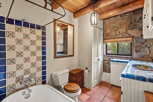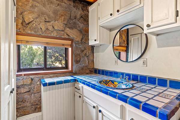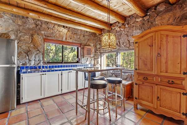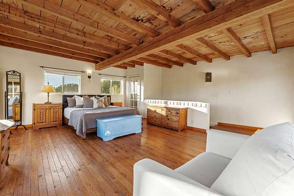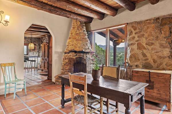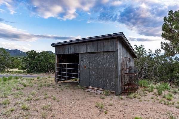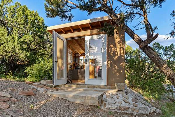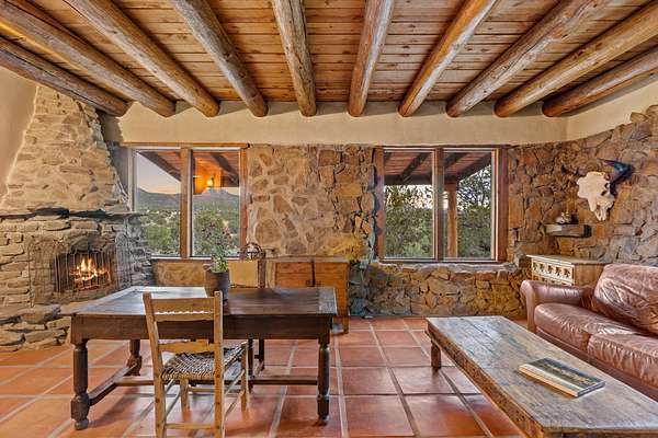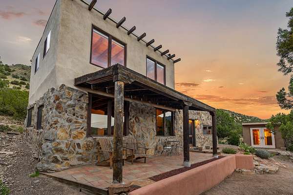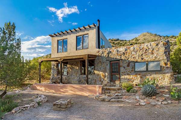 Experience sustainable Off-Grid living in a truly unique and artistically designed home. A One bedroom, one full bath Artist retreat in Madrid, New Mexico with solidly built craftsmanship. Every detail speaks to inspiration and integrity-from the hand-poured, etched entry threshold, the turquoise inlay to the artisan stone walls, hand-hewn vigas, and thick reclaimed timber beam window ledges. A mosaic tile inlay graces the foot of the richly grained hardwood staircase, and a striking stone-clad fireplace anchors the living space with warmth and enduring character. Designed for comfort and sustainability, this home offers a holistic lifestyle in a truly inspiring setting. The spacious bedroom opens to sweeping, unobstructed views set at the base of Cerro Chato and facing the majestic Ortiz Mountains. This solar-powered sanctuary offers privacy and breathtaking mountain vistas on over 10 rolling acres-just 3 minutes from the historic Turquoise Trail, under two miles from the Cultural Hub and Historic mining village of Madrid, and a short drive to Santa Fe. Live off-grid with confidence thanks to an upgraded solar system, backup generator, owned propane tank, private well 85-95 feet deep with 10-12 gallons per minute, new Norwesco 350 gallon well holding tank for the well water that fills in 40 minutes, new septic system and new leach field 2025 (infiltrator model wm-11-03-100, a newly built portal -2025, and 2021 roof. A bright, versatile outbuilding houses the solar batteries and offers additional space for storage, an office, or a creative studio. Bring your chickens, mini goats or a burro; the property includes a single stall, feed shed, and ample room for expansion. Whether you're hiking, stargazing, or simply soaking in the beauty of the high desert, this land invites deep connection with nature. For anyone dreaming of an Off-grid lifestyle- whether you're a homesteader, hobby farmer, or simply seeking peace and regeneration. Experience a rare blend of tranquility, creativity, and connection to the land-just moments from the vibrant arts, culture, and dining of Madrid and Santa Fe.