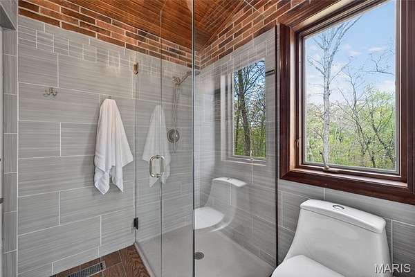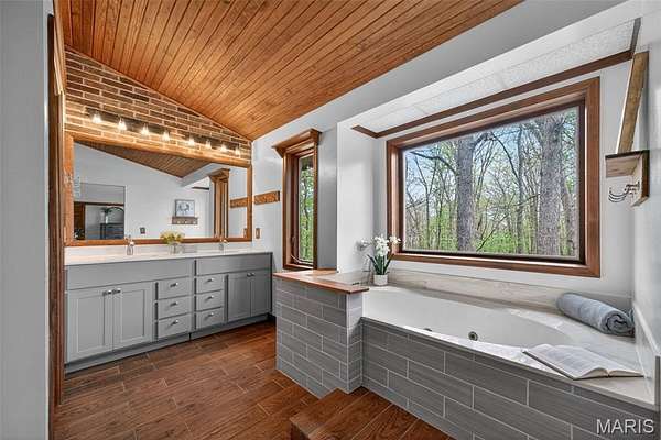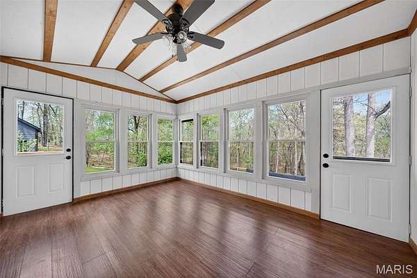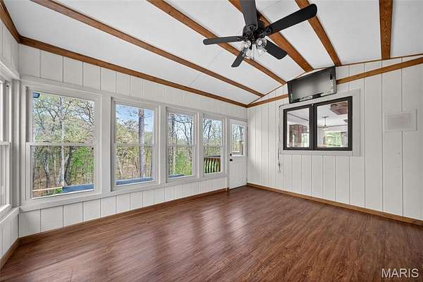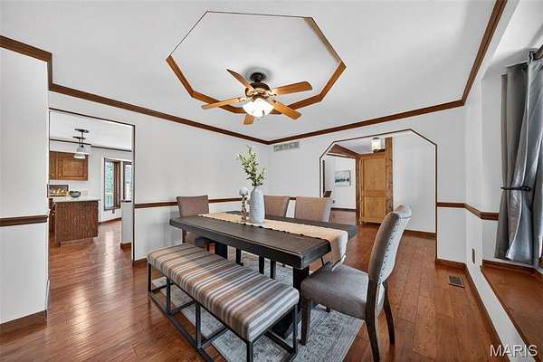 Step outside to a newly built custom deck with wrought iron spindles, or enjoy the all seasons room, perfect for taking in the scenic views. The inviting front porch leads to a welcoming foyer and a formal dining room with tray ceiling. The primary suite boasts vaulted beams, his and her walk-in closet, and an updated spa-like bath with double wave bowl vanities, separate shower, and jacuzzi tub. Two additional bedrooms and an updated full bath complete the main level.