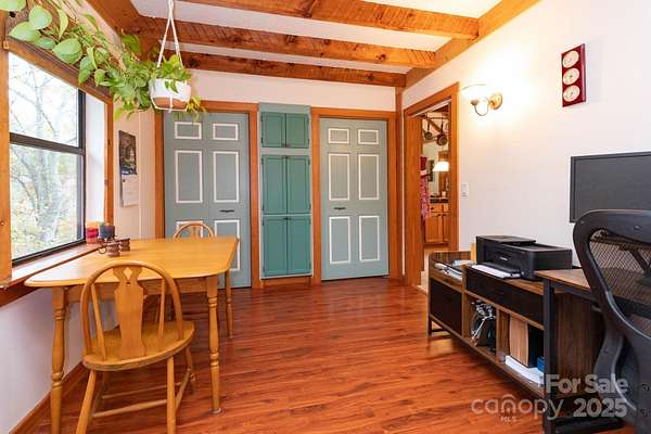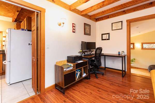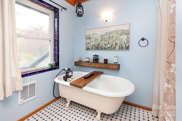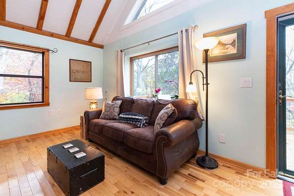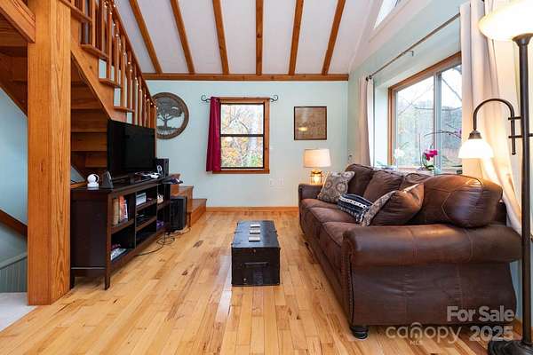 Tucked away in a private, protected holler just 15 minutes from downtown Mars Hill, this expanded A-frame cabin offers the perfect blend of mountain charm and modern comfort. Soaring vaulted ceilings with exposed beams welcome you into the open living area, while the main level features a spacious bedroom, 1.5 baths, and a bright kitchen that opens to a large deck ideal for outdoor dining or simply soaking in the peaceful surroundings. The upstairs loft provides a versatile space for a third sleeping area, office, or cozy retreat, and the finished basement includes an additional bedroom or family room plus laundry. Enjoy a private patio off the primary suite, a large workshop and shed, ample parking, and even a chicken coop. Long-range mountain views shine through in fall and winter, with wildlife and starry skies year-round. With fiber internet and no storm damage history, this is easy mountain living at its best. Schedule your showing today and experience the serenity for yourself!