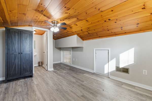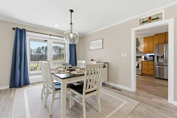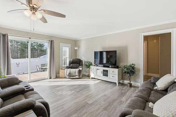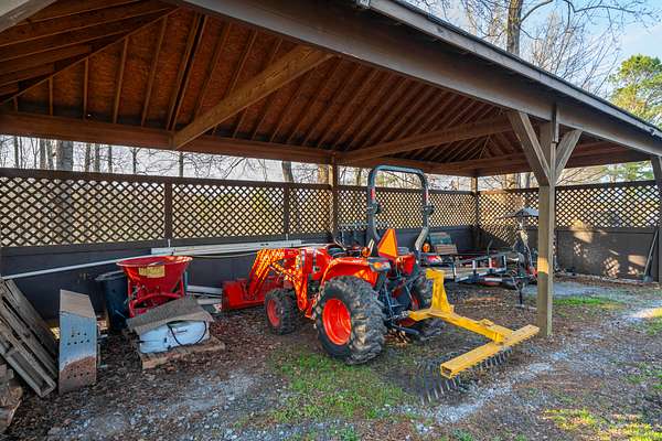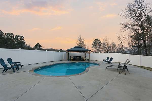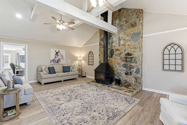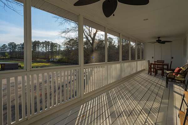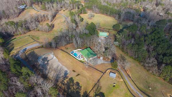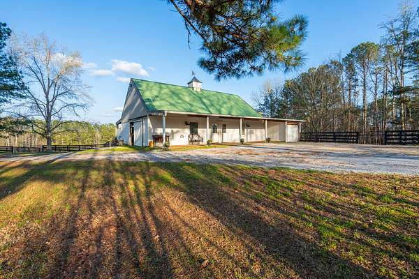 The updated single-story ranch home offers a 3 bedrooms, 2 full and two half baths, wraparound porch, plantation shutters, LVP flooring in the main living areas, and preserved original pine floors beneath. The great room features a wood-burning stove and floor-to-ceiling rock wall, opening to the dining area and kitchen with granite counters and coffee bar. With additional living space, a bonus room above the garage, screened porch, grilling deck, and pool, this Newnan horse farm combines comfortable country living with a well-equipped equestrian property.