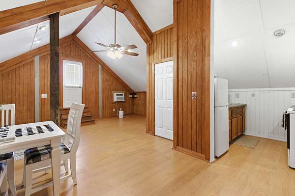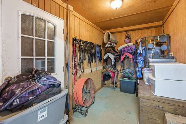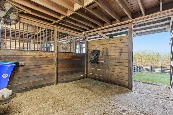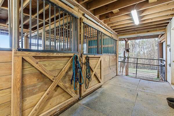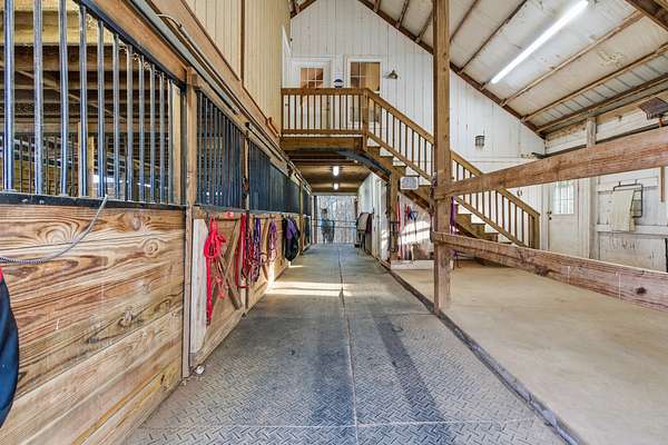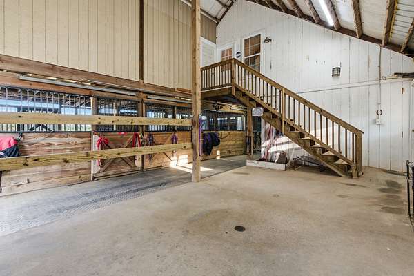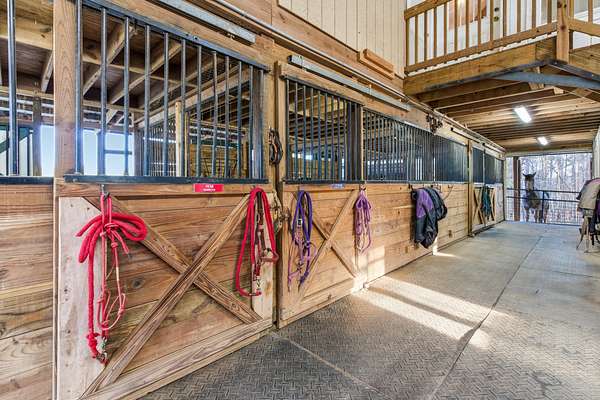 The well-appointed horse barn currently offers four stalls, including a large foaling stall that is the size of two standard stalls and can easily be divided to create five traditional stalls if desired. The barn is equipped with a hot and cold wash bay, tack room, feed room, hay barn, and full bath, with covered run-outs connecting to separate paddocks for convenient daily care and management. Above the barn is a bright studio apartment with vaulted ceilings, open living and dining space, kitchen, and a private deck overlooking the property. A nearby pole barn provides covered storage for horse trailers, farm equipment, and tools.