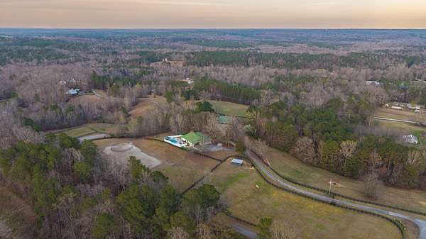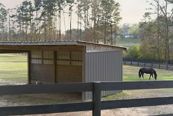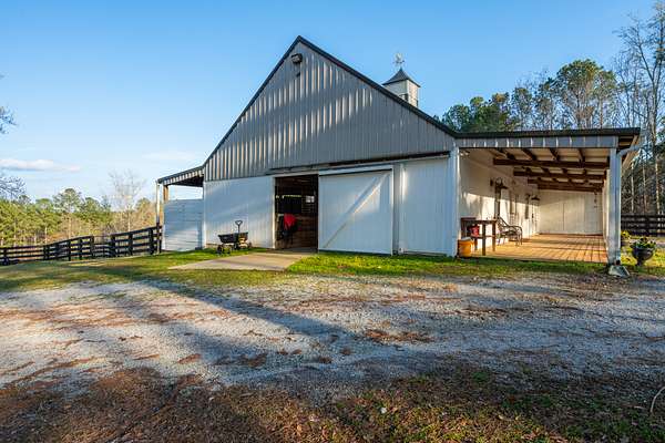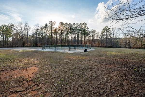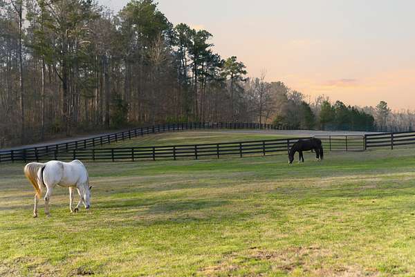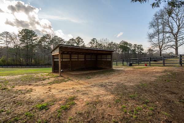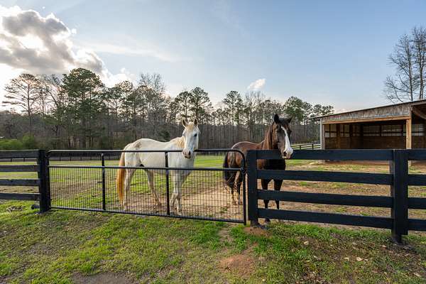 Set on just over 16 acres in Newnan, Georgia, this exceptional horse farm and equestrian property in the Saddleback Farms community offers a thoughtfully designed horse property with facilities suited for both everyday riding and horse care. The property features three primary fenced pastures with classic 4-board fencing, a run-in shelter, a large dressage arena, and additional flat arena space with another pasture in the back, creating a functional setup for turnout, training, and riding.