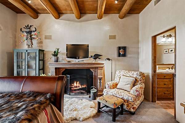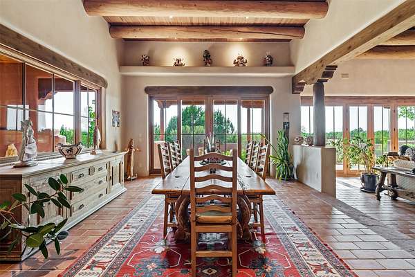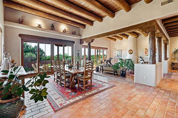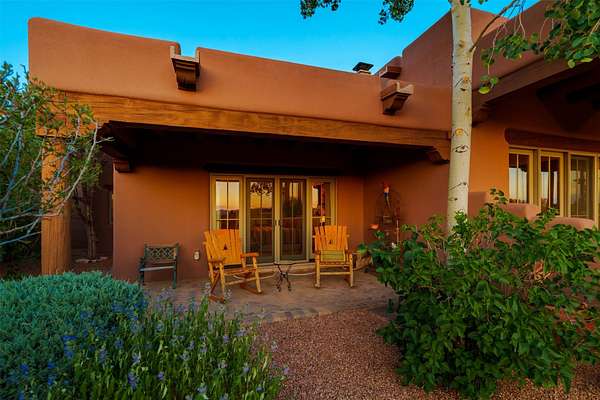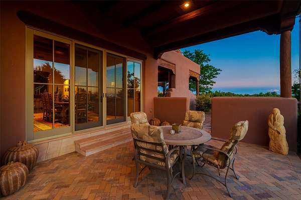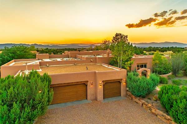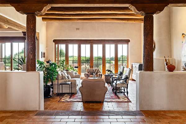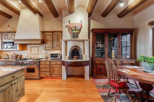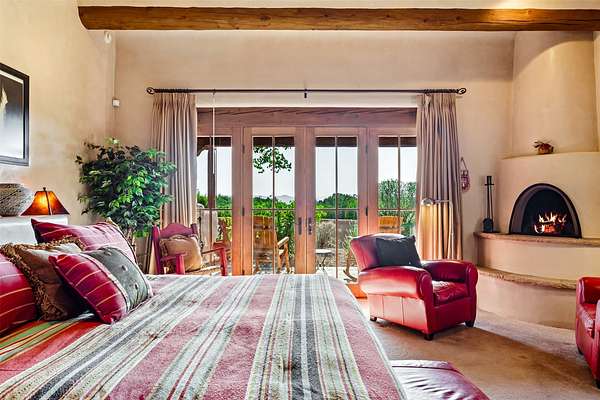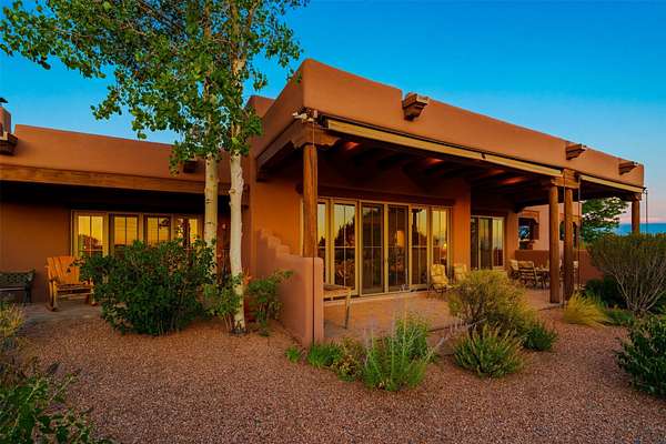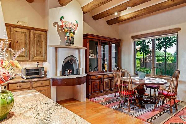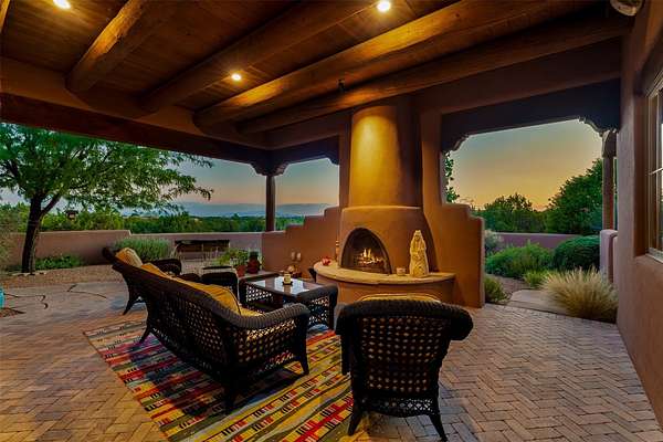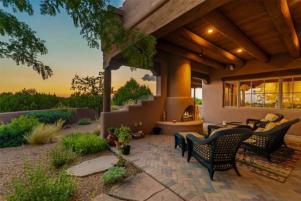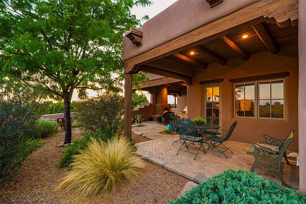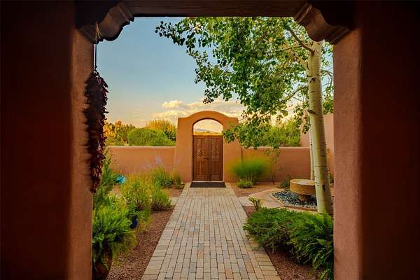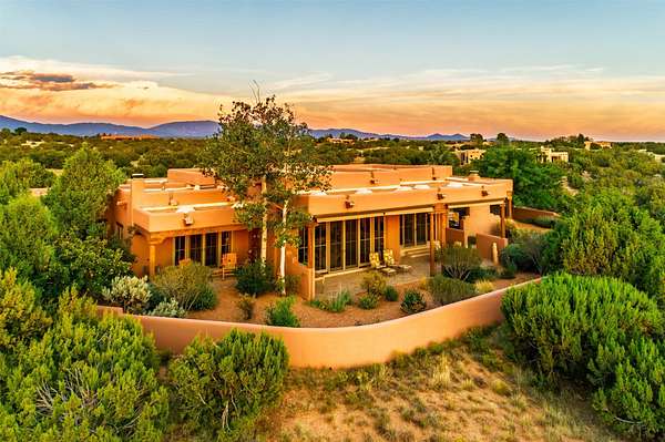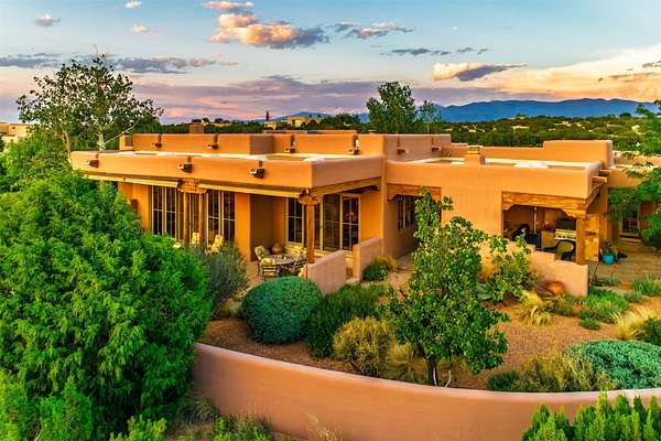Experience Timeless Santa Fe Elegance in Las Campanas. Approach this exceptional Las Campanas residence through a walled courtyard shaded by mature aspens and graced with fruit trees. Step through the grand rustic wood double doors into a spacious, light-filled central living area that seamlessly unites the living room, dining space, gourmet kitchen, and breakfast nook. The home's layout offers perfect privacy: the primary suite and office are thoughtfully situated in one wing, while two guest suites occupy the opposite side. Throughout, traditional Santa Fe craftsmanship shines-diamond plaster walls, vigas, carved corbels, and built-in shelving and nichos that invite you to showcase art and treasured objects. The living room centers around a large kiva fireplace and frames views of the Jemez Mountains. Glass doors open to an expansive portale, ideal for entertaining or simply savoring the views. The gourmet kitchen features a six-burner Wolf range, wine cooler, granite countertops, center island, and connects to a charming breakfast nook with its own kiva fireplace. The primary suite is a serene retreat with a kiva fireplace, two large walk-in California Closets with built-in storage, and a luxurious bathroom featuring a bidet toilet, steam shower, and jetted tub. Step directly from the suite onto a private portale for morning coffee or evening stargazing. A spacious office with a built-in double desk completes this private wing. Each guest suite offers an en-suite bathroom, and access to a shaded portale; one bathroom includes a double vanity and jetted tub. Outdoor living is enhanced by large, shaded portales with high viga ceilings. The main portale features a built-in gas grill and automated shades. Mature aspens, fruit trees, and lush landscaping create a peaceful, private sanctuary. This home blends the soul of traditional Santa Fe design with the comfort and functionality of modern luxury-all in the heart of Las Campanas.