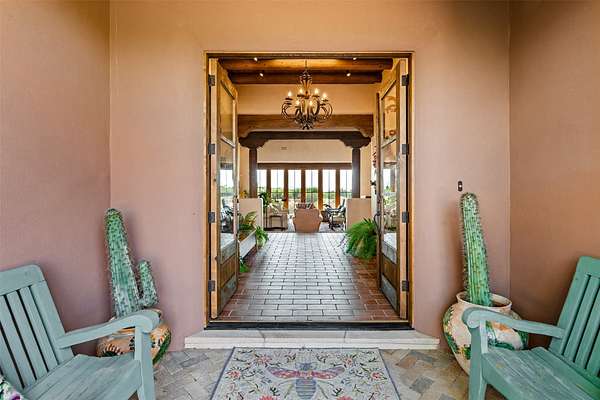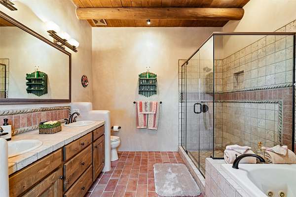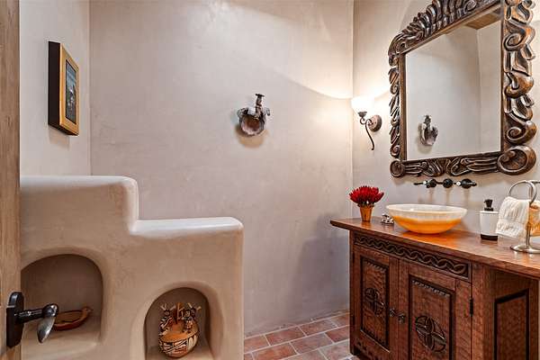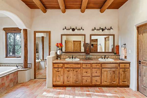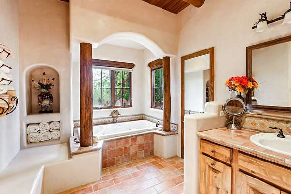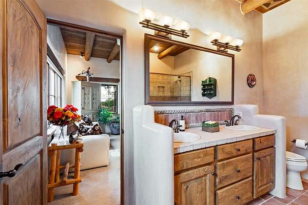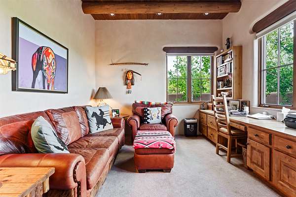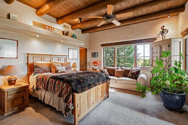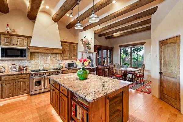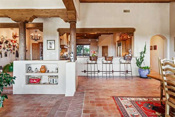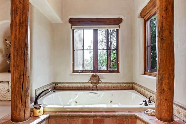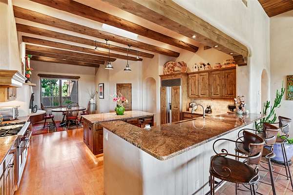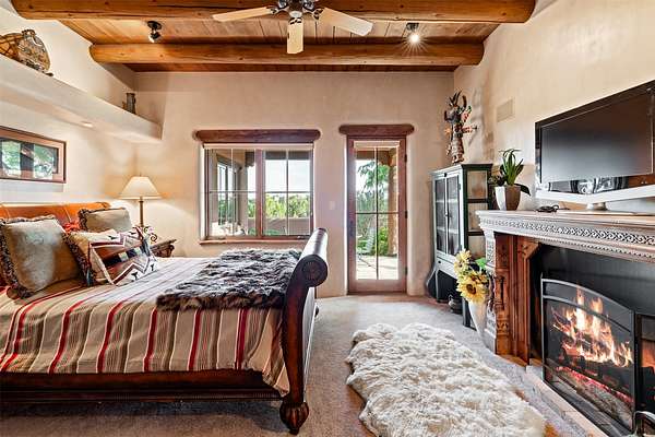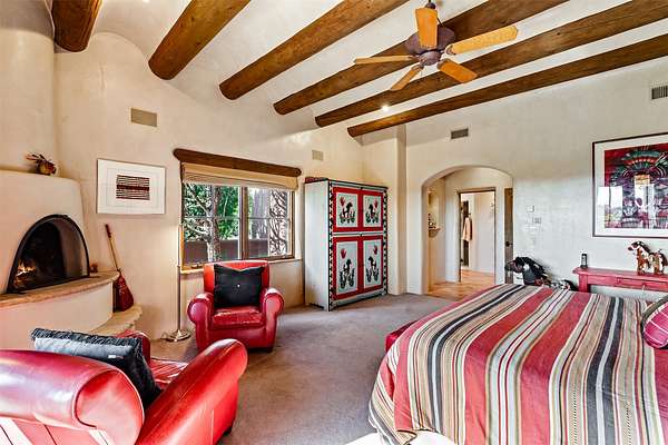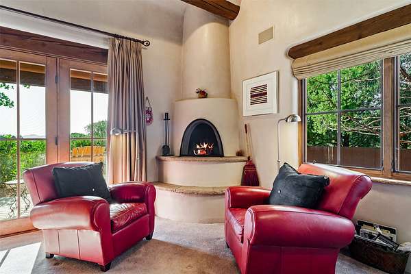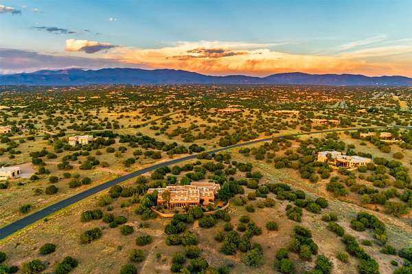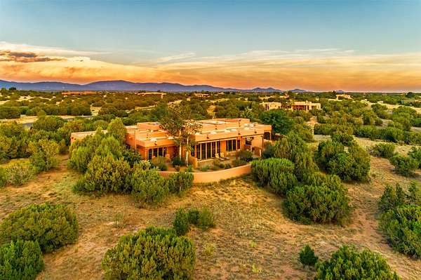 Experience Timeless Santa Fe Elegance in Las Campanas. Approach this exceptional Las Campanas residence through a walled courtyard shaded by mature aspens and graced with fruit trees. Step through the grand rustic wood double doors into a spacious, light-filled central living area that seamlessly unites the living room, dining space, gourmet kitchen, and breakfast nook. The home's layout offers perfect privacy: the primary suite and office are thoughtfully situated in one wing, while two guest suites occupy the opposite side. Throughout, traditional Santa Fe craftsmanship shines-diamond plaster walls, vigas, carved corbels, and built-in shelving and nichos that invite you to showcase art and treasured objects. The living room centers around a large kiva fireplace and frames views of the Jemez Mountains. Glass doors open to an expansive portale, ideal for entertaining or simply savoring the views. The gourmet kitchen features a six-burner Wolf range, wine cooler, granite countertops, center island, and connects to a charming breakfast nook with its own kiva fireplace. The primary suite is a serene retreat with a kiva fireplace, two large walk-in California Closets with built-in storage, and a luxurious bathroom featuring a bidet toilet, steam shower, and jetted tub. Step directly from the suite onto a private portale for morning coffee or evening stargazing. A spacious office with a built-in double desk completes this private wing. Each guest suite offers an en-suite bathroom, and access to a shaded portale; one bathroom includes a double vanity and jetted tub. Outdoor living is enhanced by large, shaded portales with high viga ceilings. The main portale features a built-in gas grill and automated shades. Mature aspens, fruit trees, and lush landscaping create a peaceful, private sanctuary. This home blends the soul of traditional Santa Fe design with the comfort and functionality of modern luxury-all in the heart of Las Campanas.
