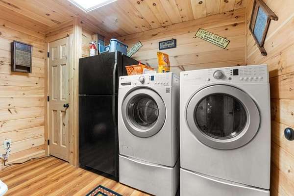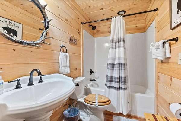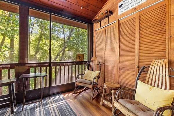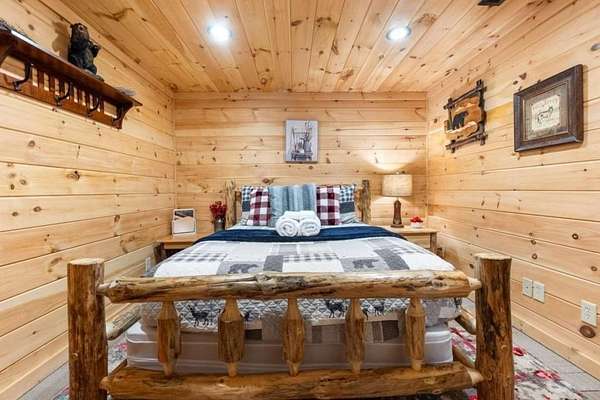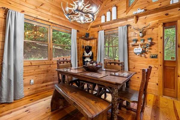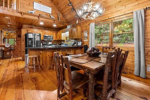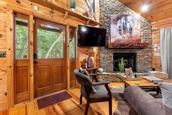Step inside to a warm, inviting interior featuring rich wood finishes, vaulted ceilings, and a cozy stone fireplace. The open-concept layout blends rustic charm with modern comfort. New furnishings throughout bring a fresh, stylish touch while honoring the cabin's authentic mountain character.
