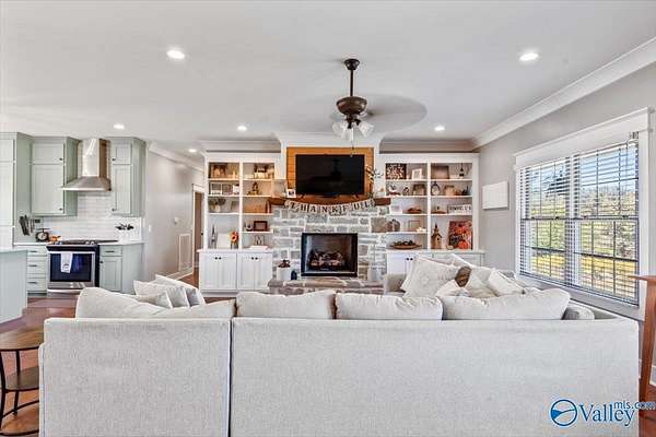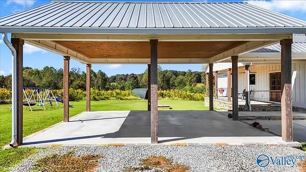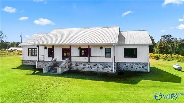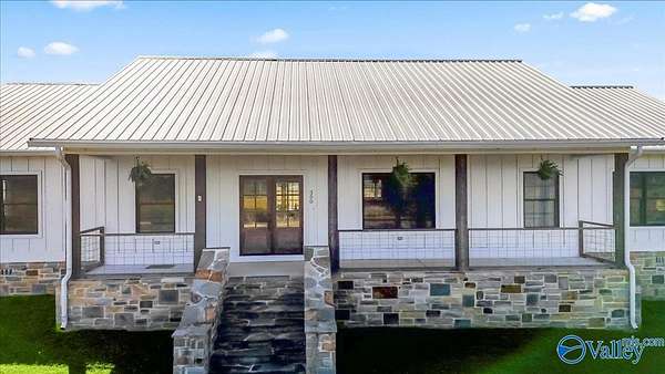 This one-level modern farmhouse is also a ready-to-go homestead and mini farm! Nestled on beautiful land, it has a high-tunnel hoop house for year-round growing and a perfect set up for grilling and entertaining. Gorgeous stonework and covered front porch with double doors welcomes you home to an open-concept kitchen, living, and dining area that centers around a stunning stone fireplace! The kitchen features quartz countertops, stainless steel appliances, and custom cabinetry, complete with a huge walk-in pantry. The spacious main suite includes a tile shower, soaking tub, WIC, and doubles as a safe room! There is a dedicated office as well as a bonus room!