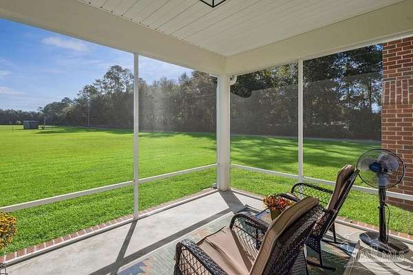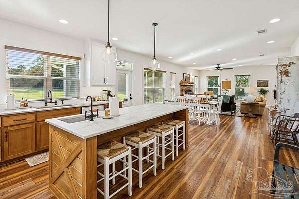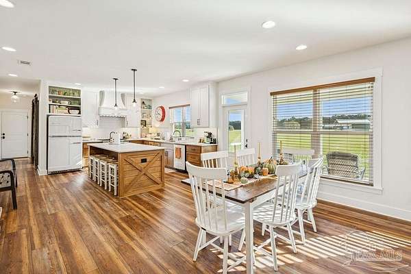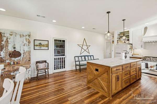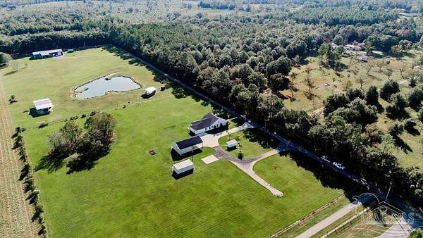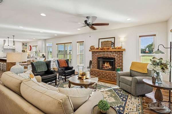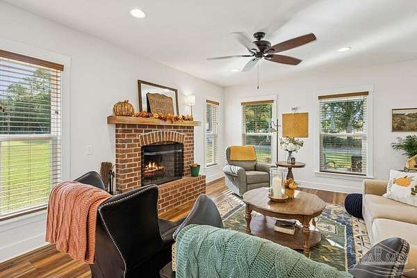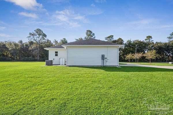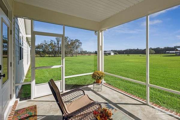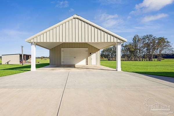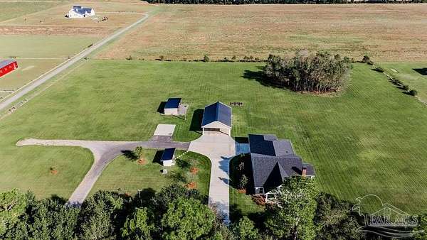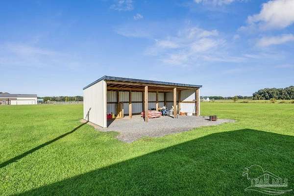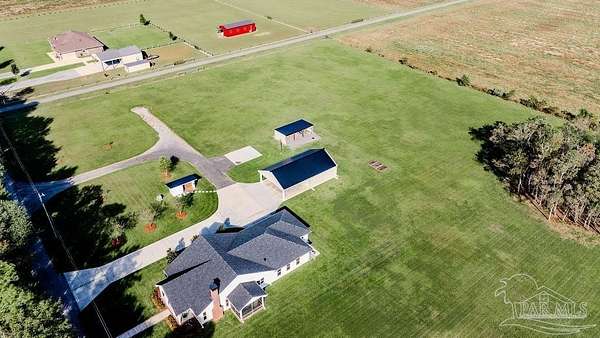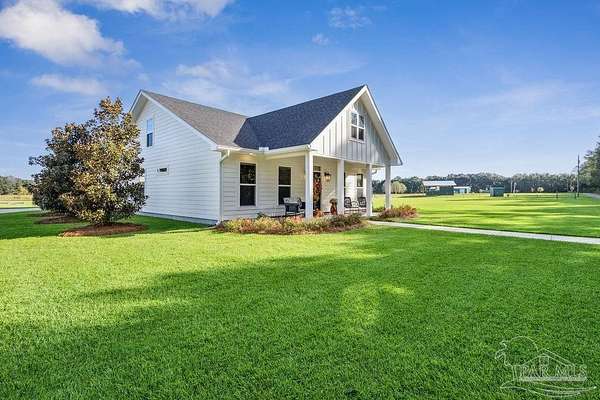 Beautifully designed home on 5 scenic acres surrounded by high-end estates. Ideally located just 5 minutes to Five Points and 20 minutes to Pensacola, this property features 2,263 sq ft of well-planned living space, a 30x50 insulated red-iron workshop, and quality finishes throughout. Interior highlights include LVP flooring, a wood-burning fireplace, and soft-close cabinetry paired with leathered Dolomite countertops and Big Chill appliances, including a gas range. The kitchen offers a tile backsplash, built-in pantry shelving with a charming screen door, and a separate mudroom entry with beautiful built-ins. The primary suite includes a walk-in closet with built-ins, a drop-in tub, and a marble walk-in shower. Additional bedrooms feature a 1 bedroom w a private en-suite and 2 additional bedrooms sharing a hallway bath with dual sinks and hallway linen storage. Additional features include: - Whole-home air purifier integrated into HVAC - Spray-foam insulation - Two 50-gallon electric water heaters - Screened back porch with dual exterior doors & transoms - Spacious laundry room with Charles Phillips barn doors - Well with pH neutralizer and filtration system Exterior amenities include a 30x50 engineered red-iron shop (25x30 enclosed + 25x30 carport) with concrete flooring, RV hookup (50 amp), generator switch, concrete drive, gutters, irrigation, wet-weather pond, and fencing. 3500 Red Ryder Lane offers the perfect balance of luxury, privacy, and convenience in a highly desirable Northwest Florida setting.
