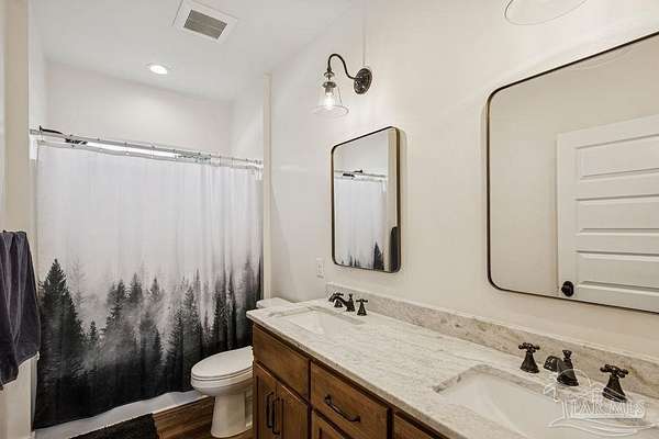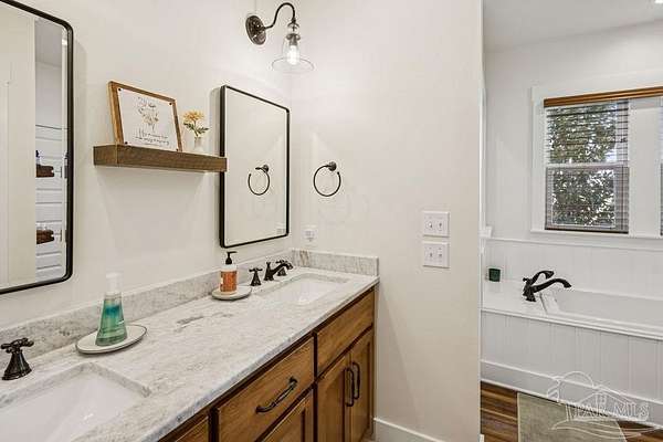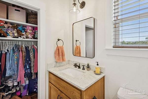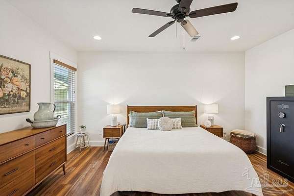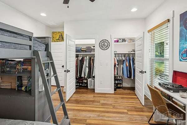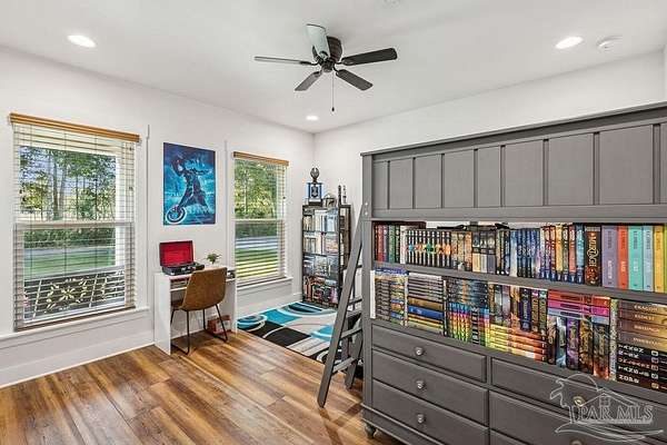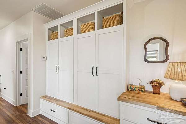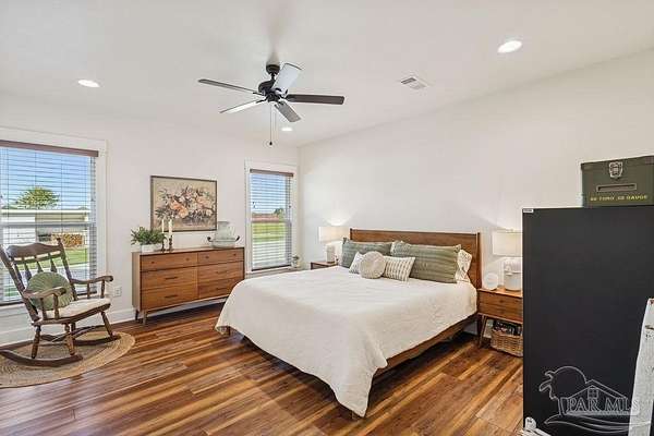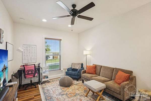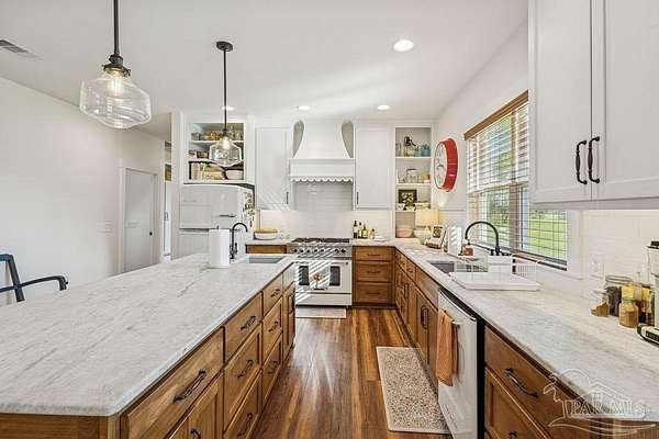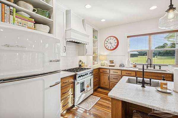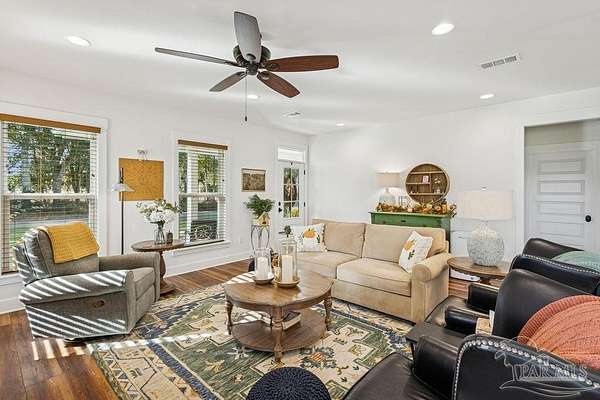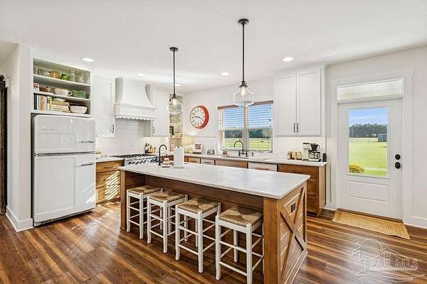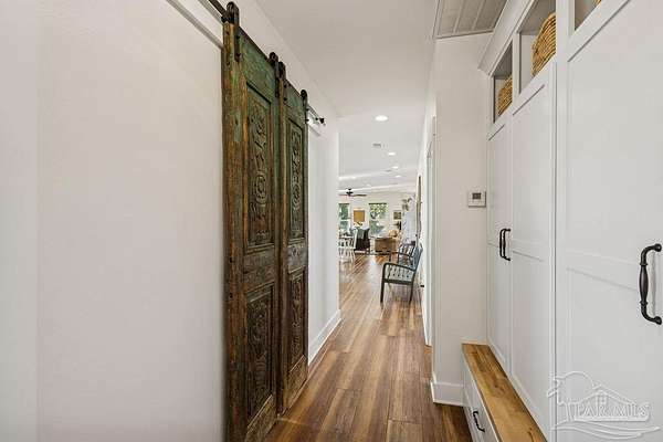 Beautifully designed home on 5 scenic acres surrounded by high-end estates. Ideally located just 5 minutes to Five Points and 20 minutes to Pensacola, this property features 2,263 sq ft of well-planned living space, a 30x50 insulated red-iron workshop, and quality finishes throughout. Interior highlights include LVP flooring, a wood-burning fireplace, and soft-close cabinetry paired with leathered Dolomite countertops and Big Chill appliances, including a gas range. The kitchen offers a tile backsplash, built-in pantry shelving with a charming screen door, and a separate mudroom entry with beautiful built-ins. The primary suite includes a walk-in closet with built-ins, a drop-in tub, and a marble walk-in shower. Additional bedrooms feature a 1 bedroom w a private en-suite and 2 additional bedrooms sharing a hallway bath with dual sinks and hallway linen storage. Additional features include: - Whole-home air purifier integrated into HVAC - Spray-foam insulation - Two 50-gallon electric water heaters - Screened back porch with dual exterior doors & transoms - Spacious laundry room with Charles Phillips barn doors - Well with pH neutralizer and filtration system Exterior amenities include a 30x50 engineered red-iron shop (25x30 enclosed + 25x30 carport) with concrete flooring, RV hookup (50 amp), generator switch, concrete drive, gutters, irrigation, wet-weather pond, and fencing. 3500 Red Ryder Lane offers the perfect balance of luxury, privacy, and convenience in a highly desirable Northwest Florida setting.