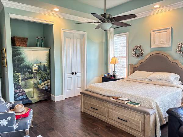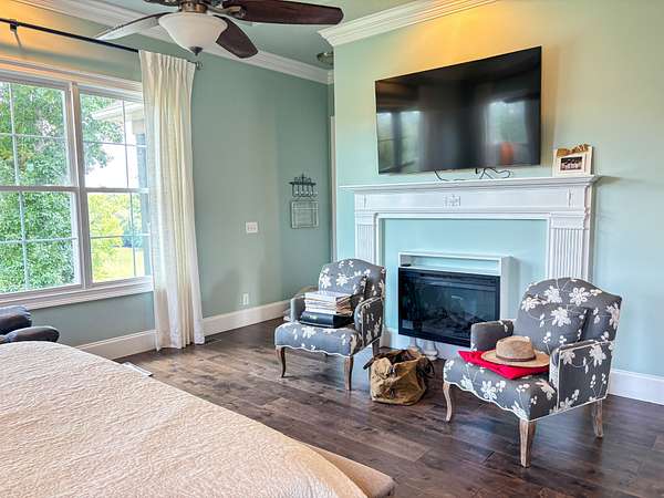 The gourmet kitchen features a gas range, built-in oven, commercial-grade double-door refrigerator, and a spacious walk-in pantry. The primary suite is a private retreat with river views, direct balcony access, a cozy fireplace, a built-in soaking tub, stone walk-in shower, and a closet that conveniently connects to the laundry room.