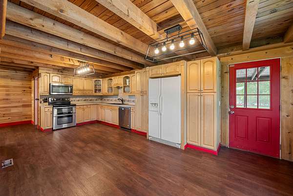 Step inside to find warm wood finishes, exposed beams, and a cozy yet spacious open-concept living area--perfect for relaxing by the fireplace or entertaining guests. The kitchen features ample cabinetry and a large dining area with views of the surrounding landscape.