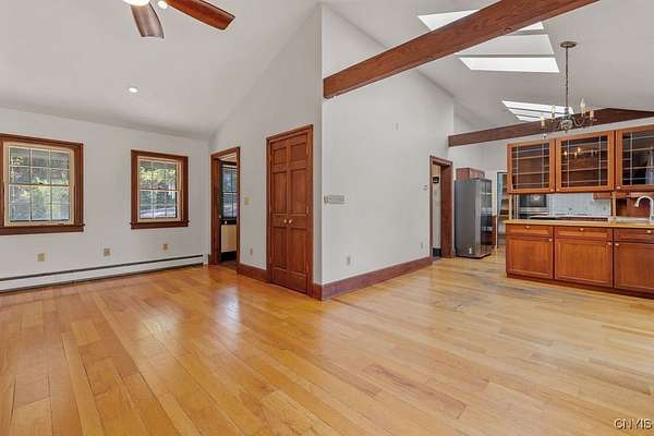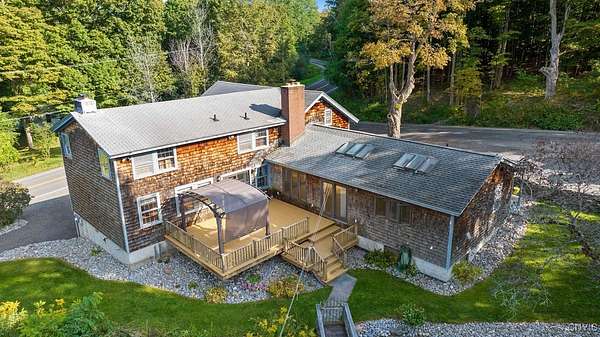 Now that winter is over 3501 Stanton road is back on the market with a new price. Welcome to your private country retreat, ideally located between Skaneateles and Otisco Finger Lakes. Spanning nearly 6 acres of beautifully landscaped grounds, this property provides a serene atmosphere complete with its own stream, an expansive deck perfect for entertaining, and an in-ground pool for relaxing summer days. This tastefully updated home has over 3,600 square feet of gracious living space. The first-floor features, refinished honey-colored wood floors and a working fireplace, adding warmth and character to the interior. The spacious cherry kitchen is illuminated by skylights and features newly installed stainless-steel appliances as well as refinished butcher block countertops, offering both practicality and aesthetic appeal. Additional conveniences include first floor laundry, a spacious great room, ideal for gatherings of any size, a large dining room open to the kitchen and formal living room. Upstairs, you will find a large main bedroom and three generously sized additional bedrooms. The hallway and some bedrooms have new carpeting, and several rooms are enhanced with built-in features. Ample closet space ensures plenty of storage for all your needs. The exceptionally large basement features nearly 9 ft ceilings, extensive built-in storage options and would be easy to refinish for additional living space. From the basement, you can conveniently access the two-car garage, which also provides additional storage space. One of the highlights of the property is the 19th-century barn, which delivers excellent space for equipment and boasts a full second floor ready for use. According to tax records, the original structure was built in 1879. Today, the only original components remaining are the rim joists, sill, and center stick beams. The foundation has been upgraded to block, and all other materials used in both the original structure and later additions are dimensional lumber and sheathing, ensuring the home's durability and modern comfort.