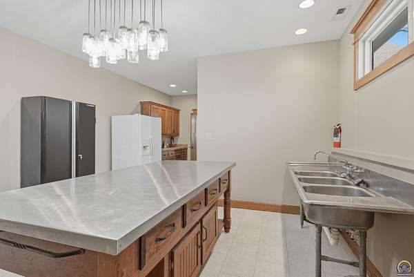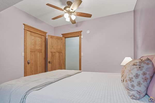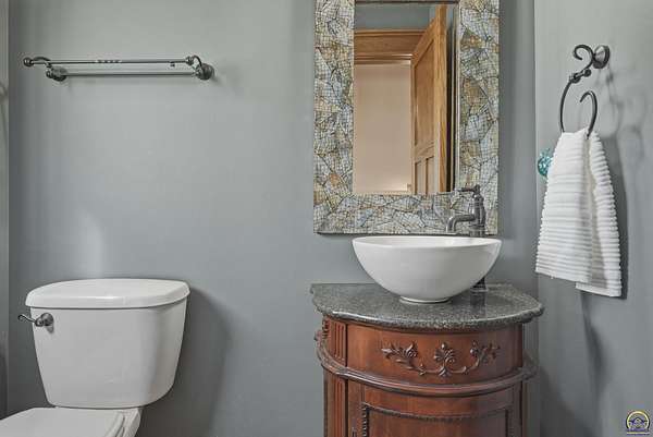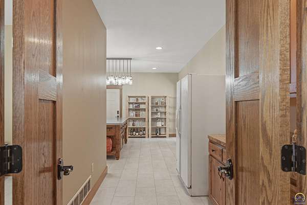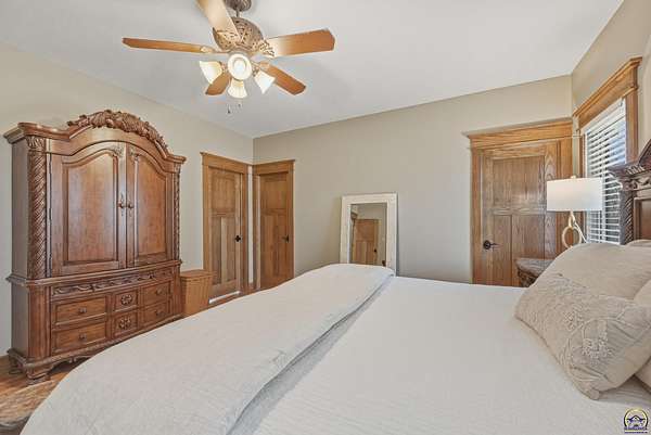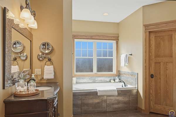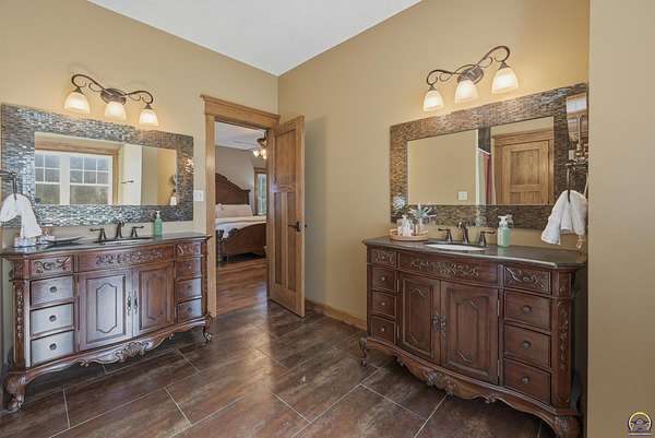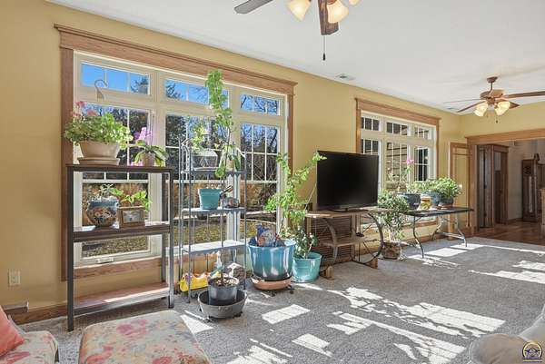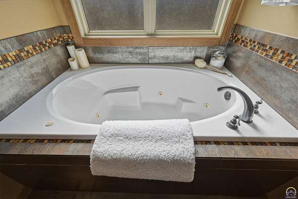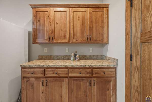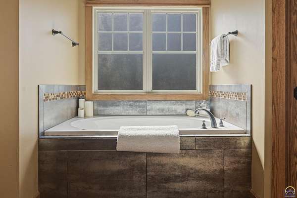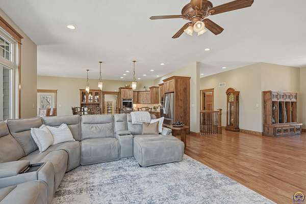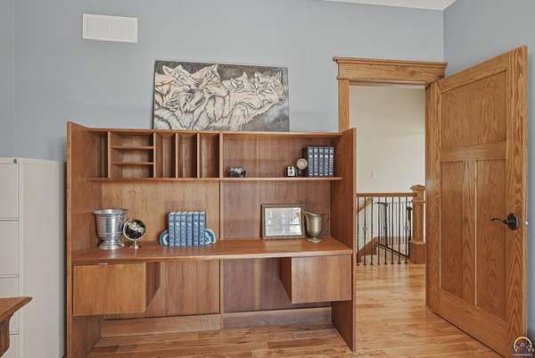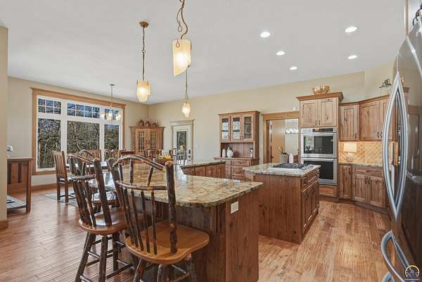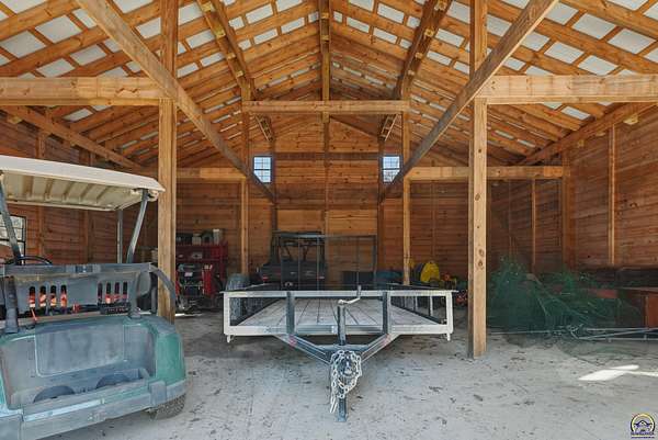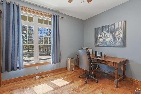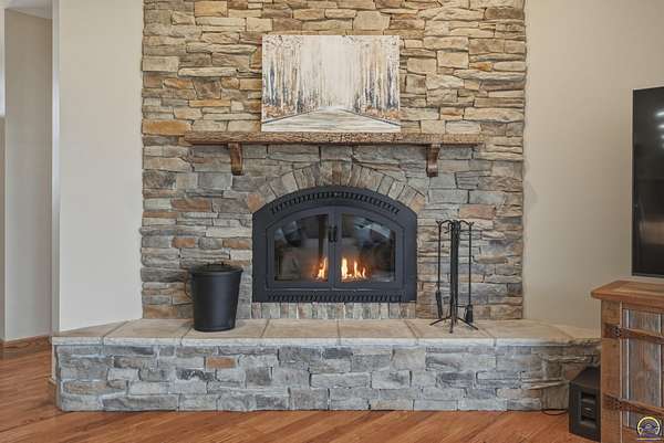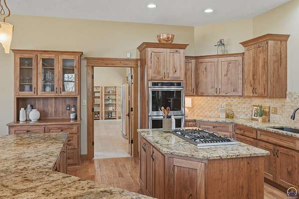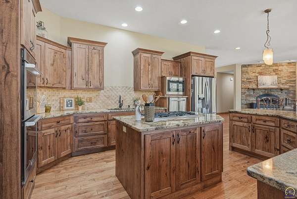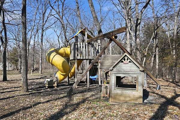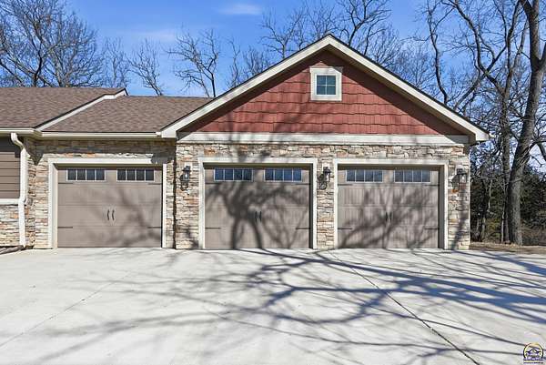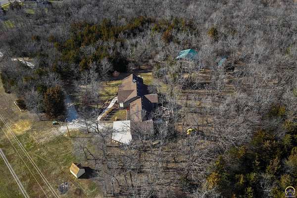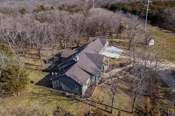 Custom-built ranch on 6.77 wooded acres in the Washburn Rural School District offering ~3,919 finished sq ft of quality craftsmanship and functional design. Built in 2013, this 5-bedroom, 3 full and 1 half bath home combines space, privacy, and versatility in a beautiful natural setting. The welcoming entry opens to an expansive main level featuring rich (engineered) hardwood flooring, solid wood doors and trim, and large windows that frame peaceful wooded views. A striking floor-to-ceiling stone fireplace anchors the living room, creating a warm focal point and seamless connection to the open-concept kitchen and dining areas. The kitchen is thoughtfully designed with granite countertops, oversized center island, built-in appliances, abundant custom cabinetry, and a dedicated secondary prep kitchen-ideal for entertaining, large gatherings, or additional workspace. With 5 bedrooms, a private office can be created for a quiet work-from-home option, while the sun-filled four-season room offers year-round enjoyment and panoramic views of the surrounding acreage. The primary suite features vaulted ceilings, generous proportions, and two large walk-in closets with custom organization systems. The spa-style primary bath includes dual vanities, jetted soaking tub positioned beneath a window, oversized tiled walk-in shower with rainfall fixture, and a separate water closet for added privacy. The finished lower level expands the living space with two additional bedrooms and a full bath, along with flexibility to create a large family room or recreation area while still maintaining extensive unfinished space for storage, hobbies, or future finish potential. Outdoor living is equally impressive. A spacious composite deck overlooks the wooded acreage and provides multiple seating areas for relaxing or entertaining. The backyard includes a rock retaining wall detail, a large playset nestled among the trees, and generous open yard space. The long windy drive leads to the oversized attached garage and also provides a second path to the impressive detached wooden outbuilding/shop-perfect for equipment, recreational vehicles, workshop space, or additional storage. Adding to the appeal, the property connects to Welton Grove Park, a 47.3-acre natural area featuring mowed and natural surface trails, wooden bridges crossing a small creek that winds through the wooded center, and scenic green space that is part of the storm water detention area. The park is outside this home's fence to the east, north, & west, offering an extension of the home's already private and nature-filled setting. This property offers the rare combination of custom construction, nearly 4,000 finished square feet, acreage, park access, and sought-after school district-delivering both everyday comfort and long-term versatility.