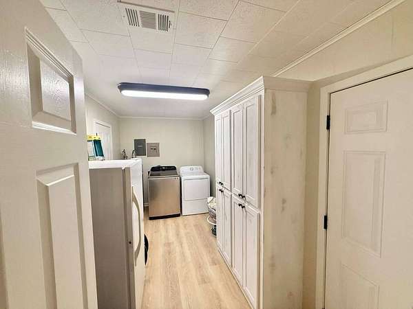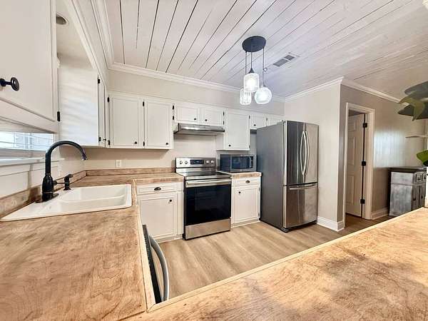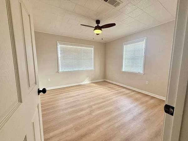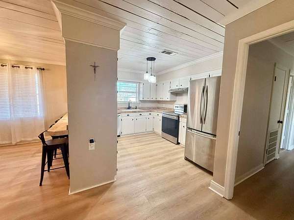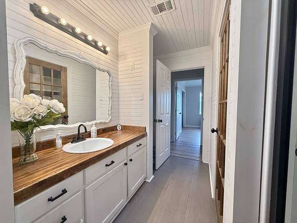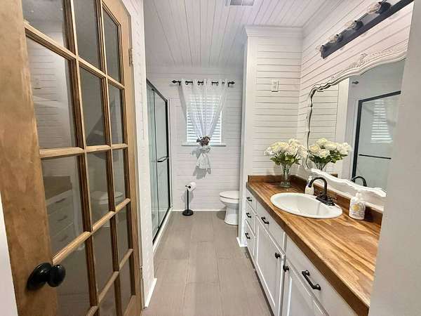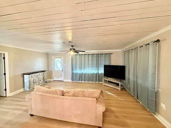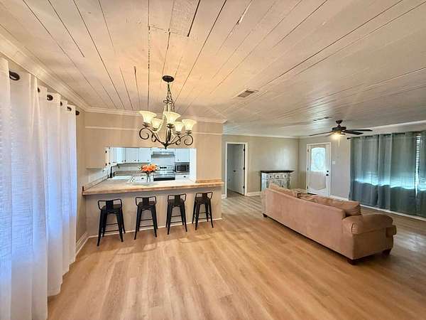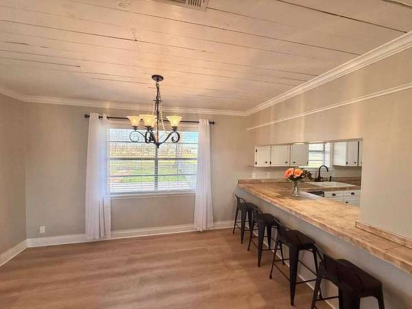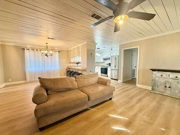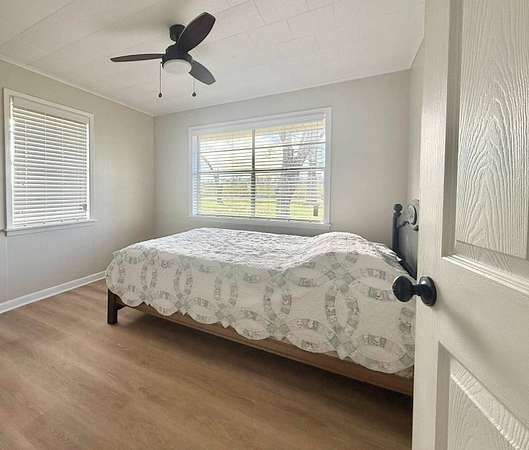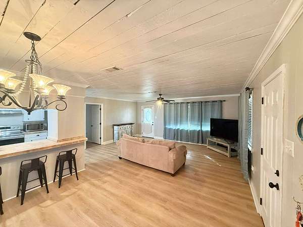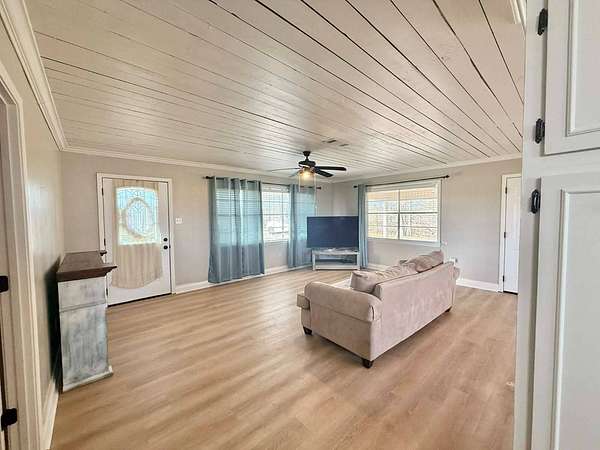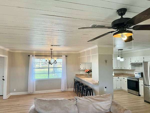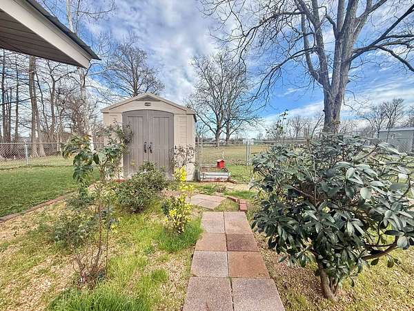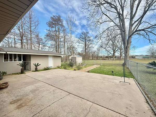 Nestled on 2.39 peaceful acres, this darling 3-bedroom, 1-bath home offers the perfect blend of comfort and outdoor living. The single-story, slab-on-grade home features a functional layout with private bath access from the master bedroom. Step outside and enjoy the serene pond, spacious patio, and outdoor kitchen - ideal for entertaining or relaxing in a quiet, country setting. The fenced yard provides privacy and room to roam, while the metal storage shed and additional empty slab in the backyard offer endless possibilities for storage, a workshop, or future expansion. This home has been very well-maintained and is move-in ready. Vinyl plank flooring is less than 1 year old, and the roof and central unit was replaced in 2020. A rare opportunity to enjoy space, tranquility, and charm all in one inviting property.