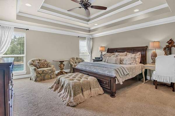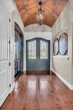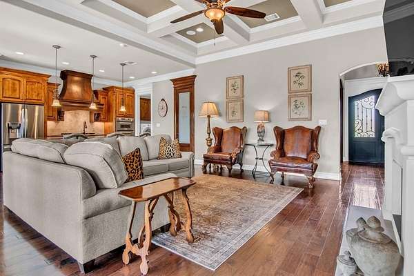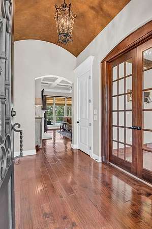 Stunning custom-built home in the prestigious gated community of Grand Harbor! Featuring 2 beautiful acres, rich architectural details, hardwood floors, coffered ceilings, crown molding, and arched entryways, all in pristine condition. The open-concept layout includes a chef's kitchen with granite counters, stainless steel appliances, and a 5-burner gas cooktop.