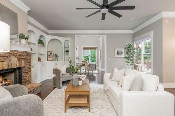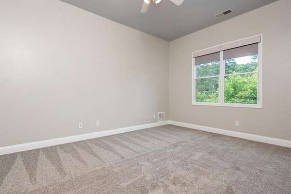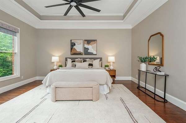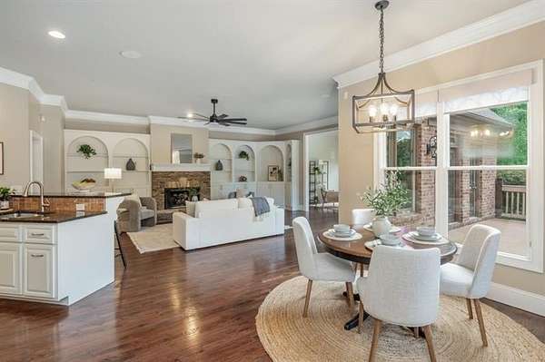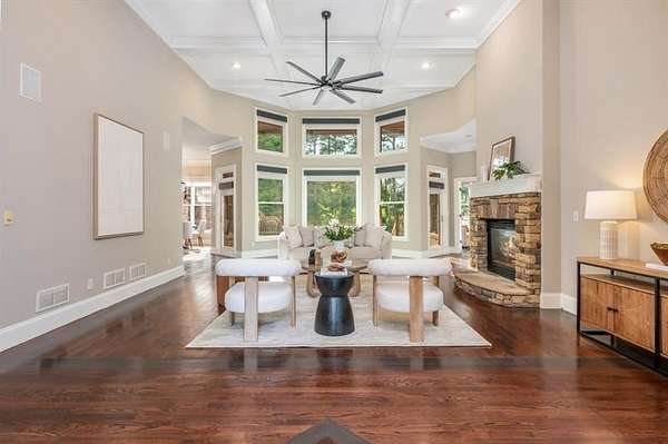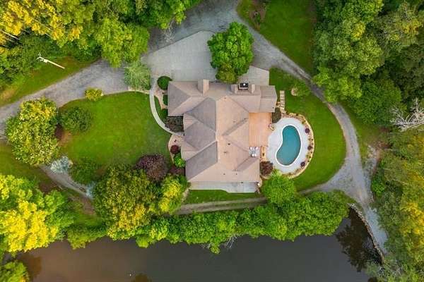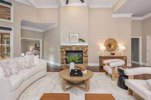 Privately set on a picturesque 3-acre retreat with wooded views and a tranquil pond, this exceptional Cumming estate offers space, privacy, and refined living. A long private drive leads to a grand covered porch with brick and stone details. The main level features a spacious living room with coffered ceilings and stacked stone fireplace, formal dining room, gourmet kitchen with stainless steel appliances, center island, walk-in pantry, butler's pantry, and a cozy keeping room with a second stone fireplace. A separate flex space just off the keeping room, ideal for a home office, offers window views of the beautiful backyard and pool. The primary suite on the main includes a sitting area and spa-inspired bath. Additional bedrooms, baths, and laundry complete the main level, while upstairs offers two oversized rooms with a Jack-and-Jill bath. The terrace level features two finished rooms, a full bath, a separate exterior entrance, and over 2,500 sq ft of unfinished space ready for build-out with electrical run (26 outlets installed) and plumbing stubbed, ideal for an in-law or guest suite. A four-car garage is offered, including one garage located on the basement level with direct access, providing excellent flexibility. Outdoor living includes a large deck overlooking a PebbleTec saltwater pool with wooded privacy. A whole-home generator adds peace of mind. Ideally located minutes from Cumming City Center, top-rated schools, shopping, parks, and golf. Welcome Home!