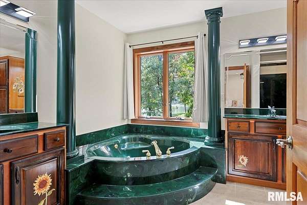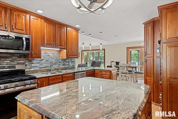 This executive-style ranch in highly desired Bertinetti subdivision offers over 4,200 sqft across 2 sprawling levels w/ 100's of ft of private shoreline. Discover 5 true BR's, 3.5 baths & a huge, naturally lit, walkout lower level is elevator equipped; intentionally designed for long-term, accessible comfort. The main floor stuns w/vaulted ceilings & the 1st of two floor-to-ceiling brick fireplace focal points in a partial open layout leading to a dream kitchen. Find incredible quality in wall-to-wall cabinetry, plus granite, high-end stainless appliances, wine storage display & massive island, while the eat in space offers back deck access & lake views for easy outdoor entertaining. The primary BR offers deluxe en suite bath with soaking tub, separate shower, dual vanity & even has its own private screened porch. Downstairs showcases that 2nd floor to ceiling FP w/natural light pouring through oversized windows throughout. In a layout that feels like another main floor, you'll enjoy the full 2nd kitchen w/appliances that stay, 2nd laundry hook up, 2 flexible bonus rooms, storage & endless potential that walks out to a delightful patio overlooking the lake. A fantastic lakefront lot is just a small piece of this truly pristine property that also comes w/total peace of mind. Perks like Generac generator w/dedicated propane tank, oversized, heated garage, boat dock & lift combined w/major updates such as roof & gutter guards new in '22 equals unequivocal value on the lake!