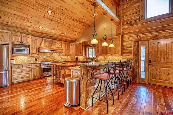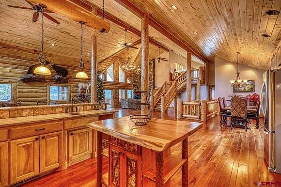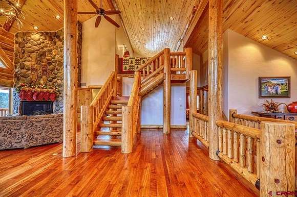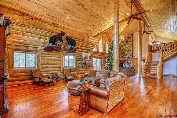 Jon Johnson, Sherpa Real Estate, C: 970-946-3112, jon@sherparealestate.com, www.crenmls.com: Mill Creek Majesty: Beyond compare, this incredible Colorado lodge/retreat offers one of the most unbelievably dreamy view settings of any location in our beautiful corner of the state. Resting above and adjacent to the historic Mill Creek Ranch and surveying vast and intimate views of a working cattle ranch with lush meadows, ponds and storybook character, this property is exceptional. Surrounded by massive alpine National Forest acreage and rugged peaks, this unforgettable offering is truly post card perfect The masterfully crafted lodge offers a one of a kind legacy opportunity for you and your family or company. My superlatives fall short so you'll need to experience it "boots on the ground" for yourself. Before we move on, take a few minutes to watch the stunning drone footage of this property and the extensive number of photos contained in the virtual tour. Links attached. Upon arrival you'll cross an elevated entry bridge onto a massive covered deck. The allure of the peaks will instantly draw you to the panoramic views engulfing the property. You'll imagine the four season splendors from this perch. The tranquility, crystal clean mountain air, wildlife and incomparable beauty of this setting will still your heart. Step into the home and you'll be enraptured by the towering ceilings, massive amounts of hand crafted log and and the inviting great room, designed specifically with relaxation and entertainment in mind. The open floor plan, custom finishes, native river rock fireplaces and exposed timbers create a sense of rugged quality and mountain luxury. Interior upgrades abound including cherry wood flooring, custom lighting fixtures, slab granite, a large Wolfe commercial stove, quality cabinetry, stainless appliances, coppers sinks, two river rock fireplaces, chunky hand hewn log trim and solid alder doors. The retreat also offers a terrific game room plus a movie/media room, bunk room, large utility room with outdoor access and over-sized garage to store all your toys and adventure gear. There is also added storage all around the ground level under-deck for more full sized toys and equipment. The master suite is on the main level and it has private access onto the covered deck, it's own fireplace, tall ceilings, walk in closet and huge custom shower. There is a bonus open loft study above the great room, accessed via a hand crafted log staircase which serves as an additional nest to unplug and relax. Step outside and journey to the top of the property and experience another massive top-of-the-world view experience. To the north you'll survey a pristine meadow passage which takes in unparalleled panorama of both the east and north peak ranges of mighty San Juan Mountains. The views from the picnic table at the top of the property will leave you absolutely spellbound, I promise. Connecting the upper and lower elevations of the property is a massive rolling sled/ski hill which rival some runs at Wolf Creek. Grab your sled, your hiking boots or your mountain bike and give it a go. Again, another one-of-a-kind feature of this very special offering.You'll find it nearly impossible to adequately describe this property to your friends and family. It is truly a "must experience" listing which is utterly divine. National Forest access is only minutes away from the home.
