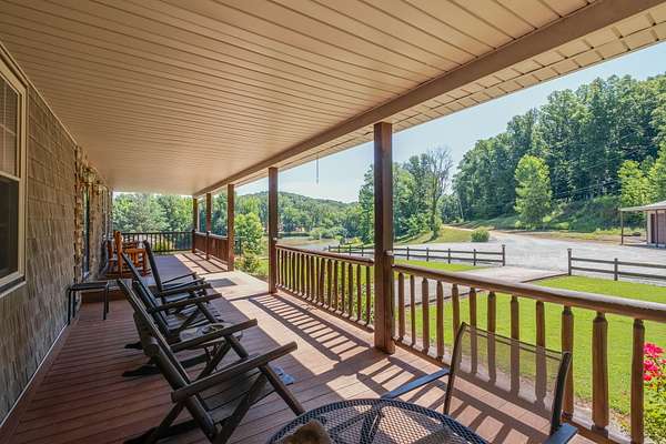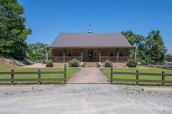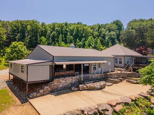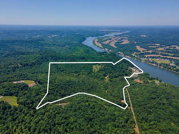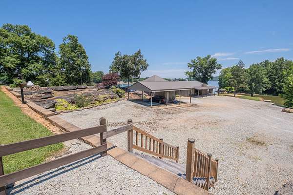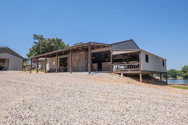As you enter through the gated entrance, you'll travel along a private drive that winds for over half a mile through scenic hillsides with large rock outcroppings and wood lines, where deer and turkey often feed by the roadside. Midway through your journey, you'll pass a large covered equipment shed, which can be easily enclosed for animals. Just beyond this point, you'll catch your first glimpse of the water inlet, a unique and very rare feature of this property. There's probably less than a handful of these inlets along this 184-mile-long streatch of the river, making Harris Landing truly exceptional.