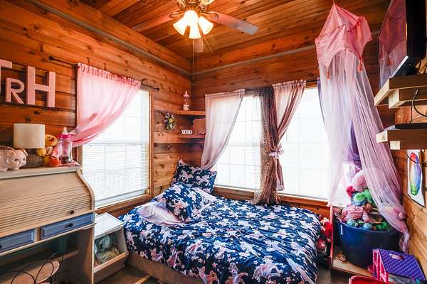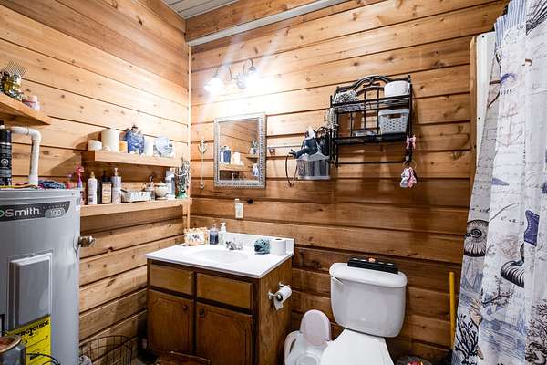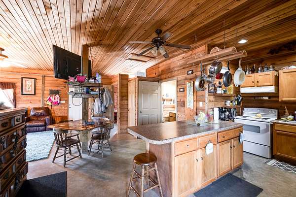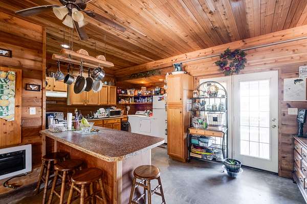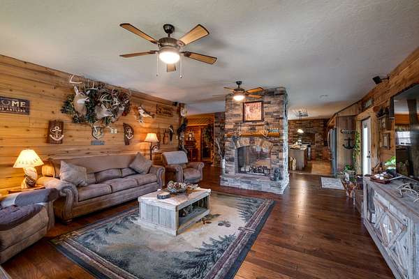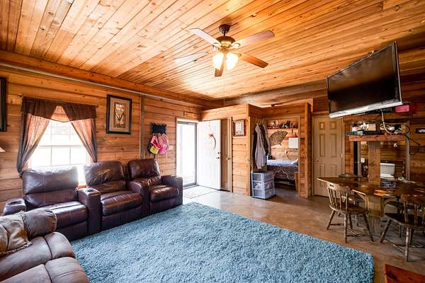 A little way up from the guest house, you'll find the 2-bedroom, 2-bath main home, showcasing stunning woodwork throughout, a galley-style kitchen, and a striking two-sided fireplace. Two large covered porches offer views of whitetail deer from the front porch and relaxing waterfront views from the back.