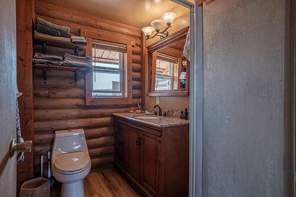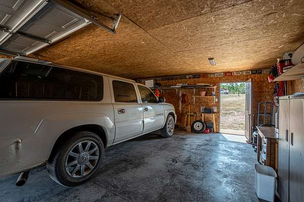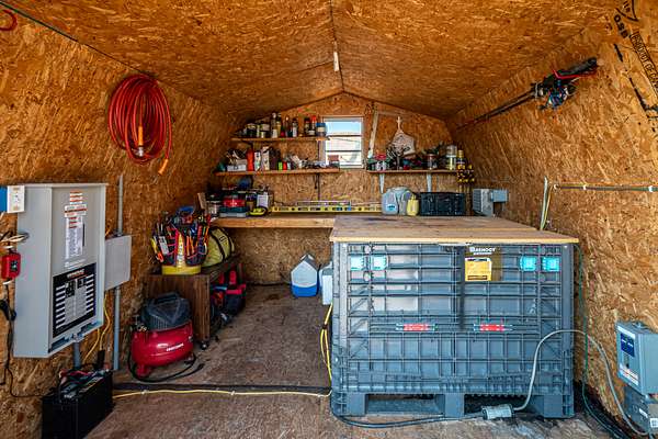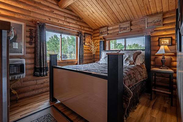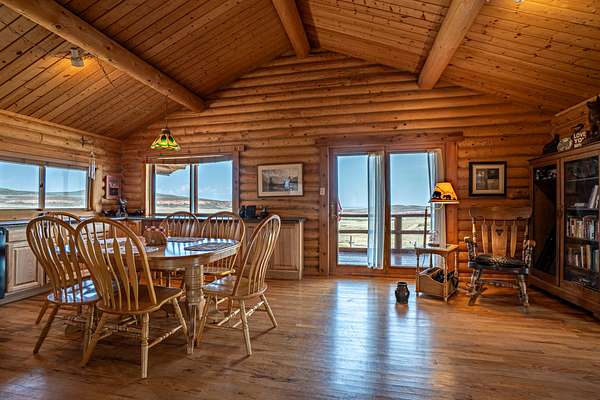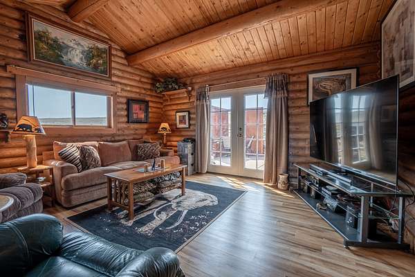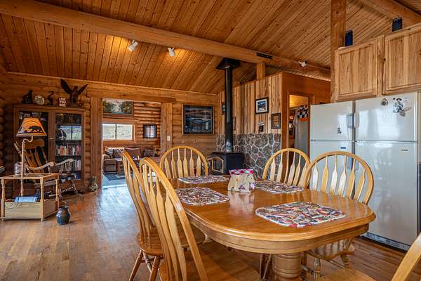 The cabin features an open-concept design with two bedrooms and a full bath. The large windows throughout the cabin allow natural light to flood the interior and offer truly special views of the surrounding area. Additionally, the property includes a two-car detached garage with ample storage, as well as two large sheds, providing plenty of space for vehicles and equipment.