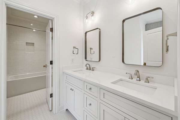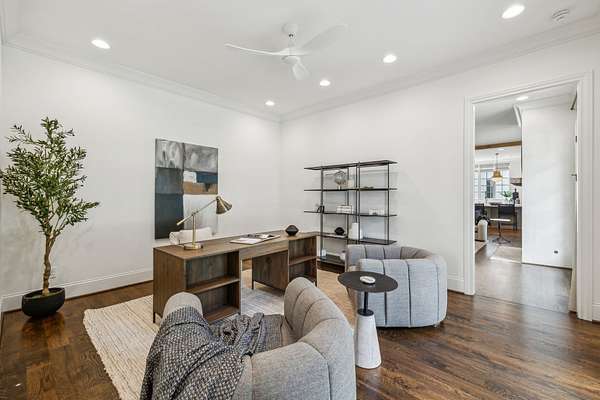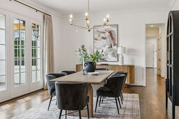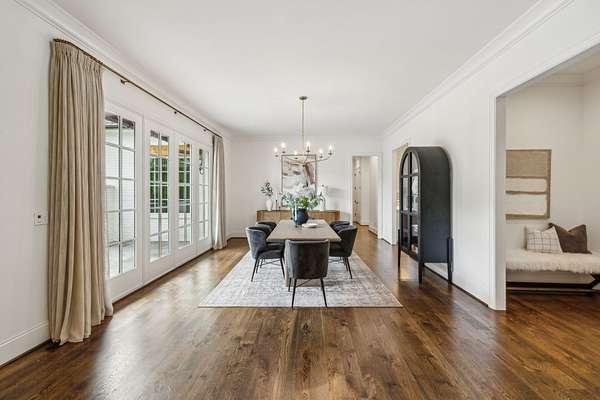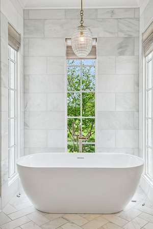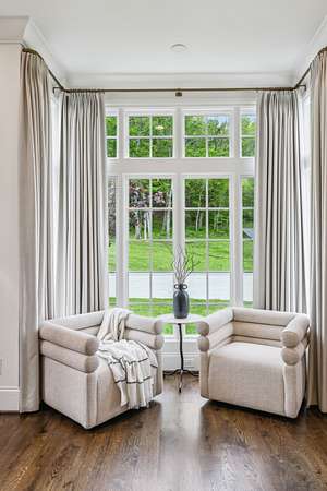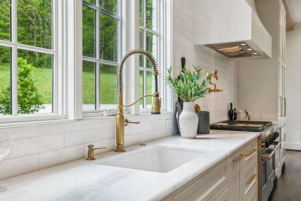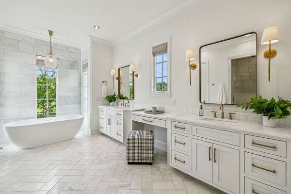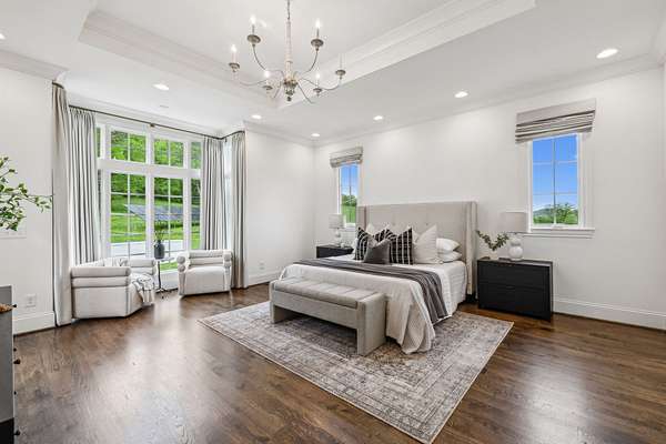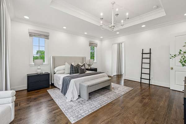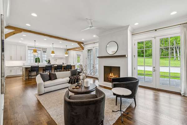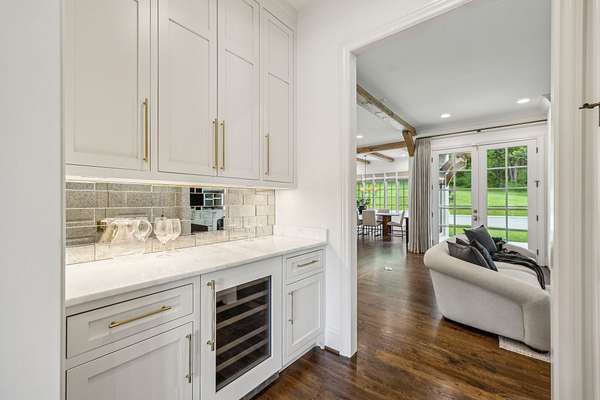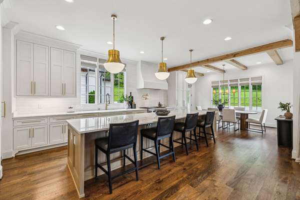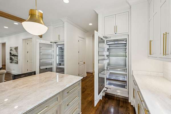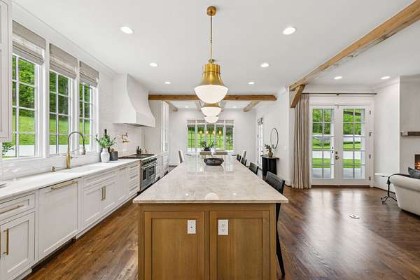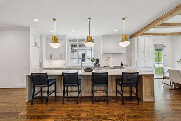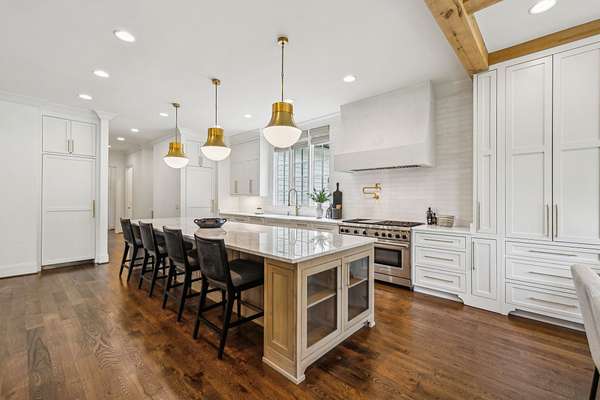 Inside, five impeccably designed bedrooms and five-and-a-half luxurious bathrooms showcase meticulous craftsmanship and attention to detail. At the heart of the home, a chef's kitchen serves as a true culinary masterpiece, featuring a stunning Taj Mahal Quartzite island, custom cabinetry, and top-tier appliances--including a Thermador column refrigerator and freezer, Thermador microwave, and a professional Wolf gas range with six burners, a griddle, and a double oven. Thoughtfully curated designer lighting, elegant beam detailing, and refined crown molding add layers of warmth and sophistication throughout.