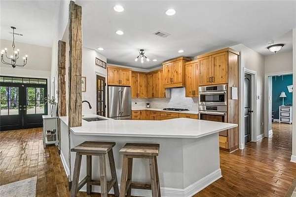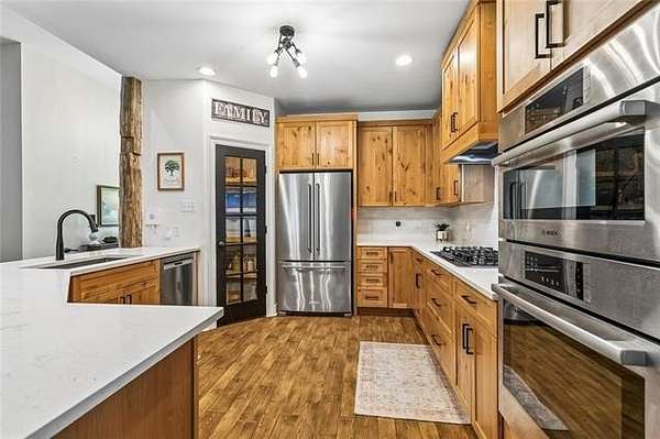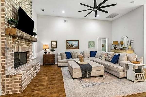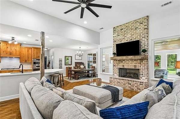 The living area features ceramic tile flooring throughout, a raised brick hearth fireplace with an ax-cut white oak mantle, and an open layout filled with natural light. It flows seamlessly into the kitchen, complete with quartz countertops, Bosch stainless steel appliances, a large eat-in breakfast bar, and an expansive pantry, great for everyday living and entertaining!