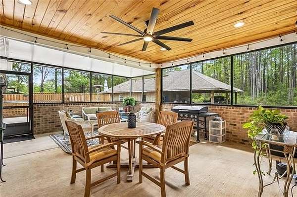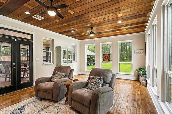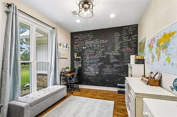 The primary suite showcases a triple tray ceiling, generous closet space, and a well-appointed ensuite with separate tub and shower. A versatile room off the foyer can serve as a formal dining space, office, or playroom, while the game room with reclaimed beadboard ceiling and abundant windows offers even more room to gather and relax.