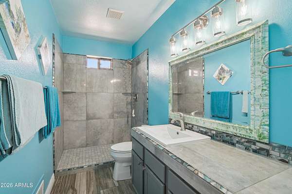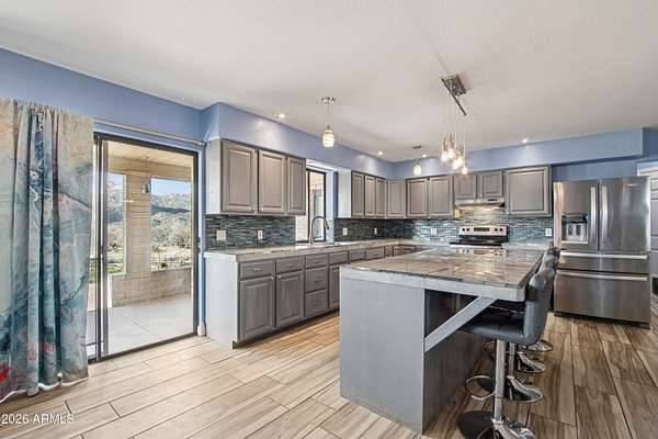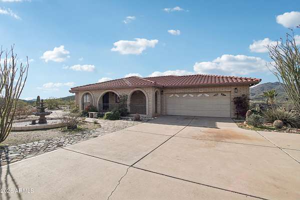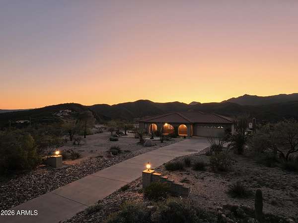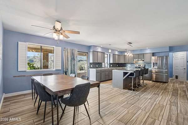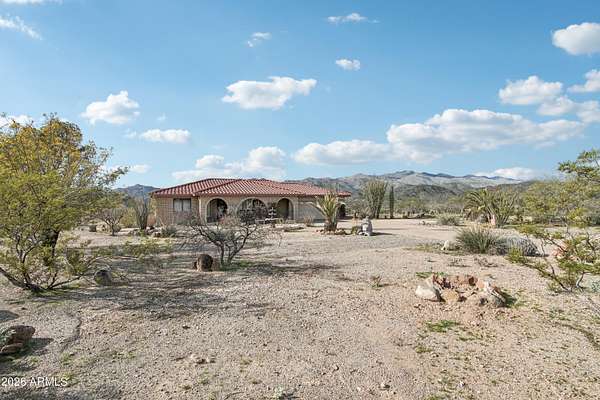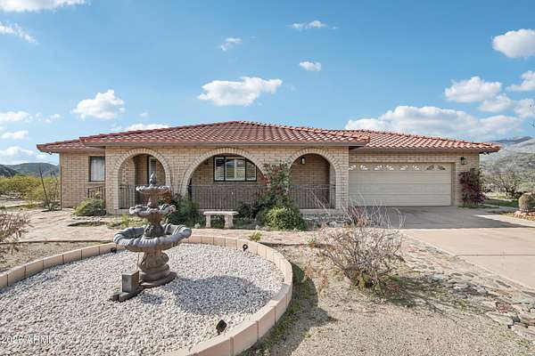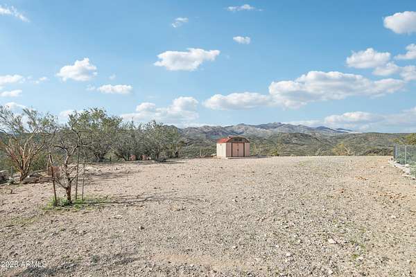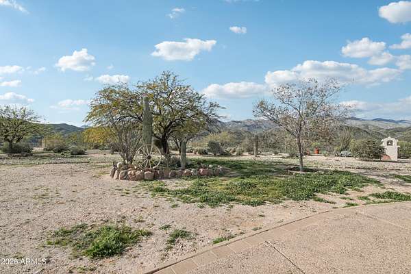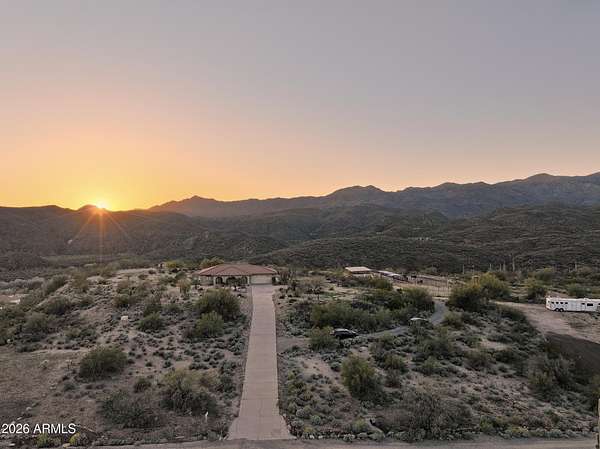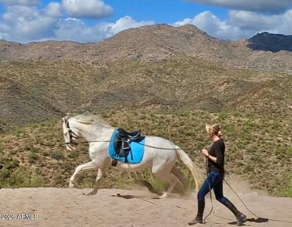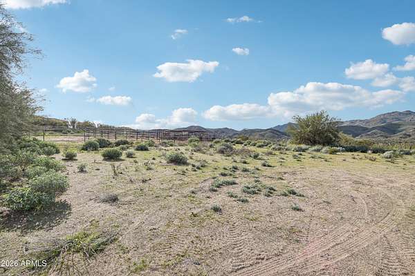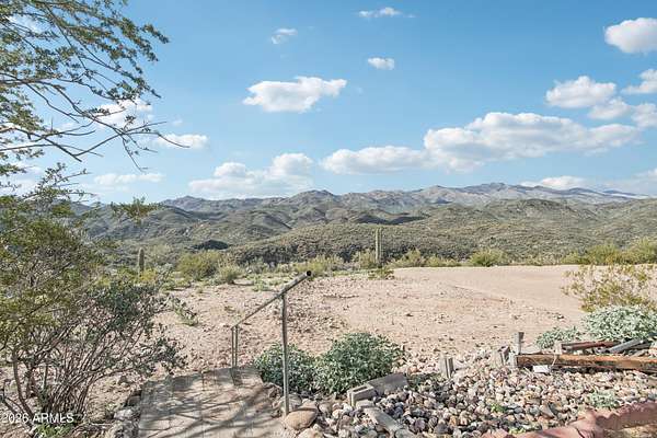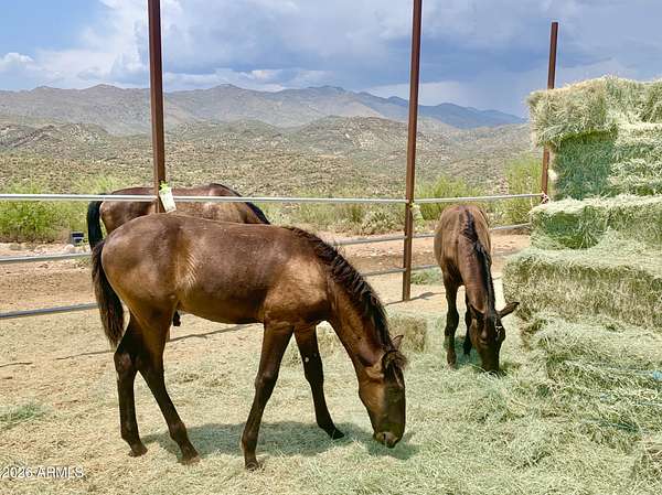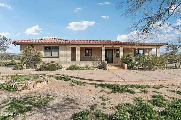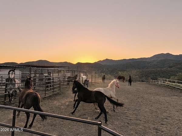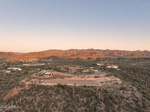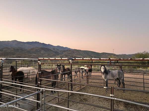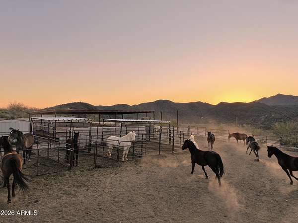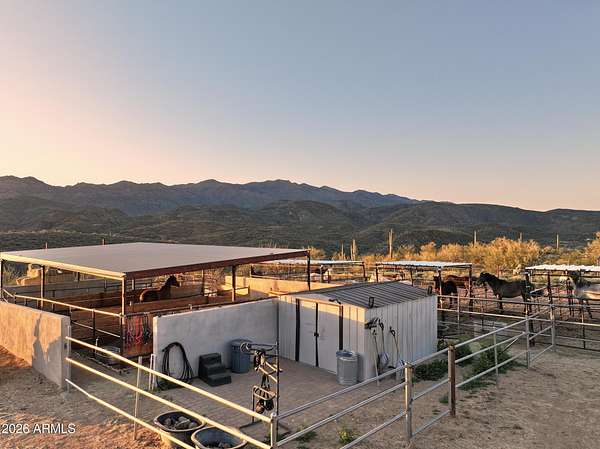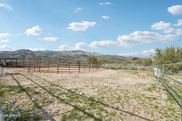 Set high above the desert floor on the rolling hills of Black Canyon City, this exceptional 11.57-acre horse ranch offers a rare combination of true 360-degree panoramic mountain views, subdivision potential, and fully built equestrian infrastructure, all in a setting defined by privacy, elevation, and natural beauty. From sunrise to sunset, the property delivers uninterrupted vistas of surrounding mountain ranges, open desert, and ever-changing skies, creating a sense of scale and serenity that is increasingly difficult to find. The land itself presents significant future flexibility, with acreage suitable for subdivision into multiple lots, the addition of guest homes, barns, arenas, or auxiliary structures. You could create a multi-generational or income-producing estate, making this an ideal opportunity for horse owners, developers, or buyers seeking long-term land value. At the heart of the property sits a well-maintained single-level residence featuring 3 bedrooms and 2 fully updated bathrooms, designed for comfortable everyday living with seamless indoor-outdoor flow. The home has been thoughtfully upgraded with wood-grain ceramic tile flooring throughout, creating a cohesive, durable, and low-maintenance living environment ideal for an active ranch lifestyle. The updated kitchen is both functional and inviting, showcasing stainless steel appliances, striking 24x24 tile countertops, a large center island with seating, and ample workspace for entertaining or daily use. Generous living and dining areas provide flexible gathering spaces, all positioned to take advantage of natural light and surrounding views. Both bathrooms have been tastefully renovated with walk-in showers, tall cabinetry, updated sinks, faucets, and fixtures, offering modern convenience while maintaining a clean, timeless aesthetic. Outside, a large covered patio and expansive backyard provide ideal space for relaxing, entertaining, or simply taking in the surrounding landscape. What truly sets this property apart is its extensive, professionally designed equestrian facility. The ranch includes multiple corrals, sheds, overhead horse shelters, a full-size dressage arena (70' x 200'), wash rack, and open turnout areas, allowing horses to roam and train comfortably. There is also room for a covered arena or indoor arena to be built on the property. The layout supports efficient daily care, training, and movement, whether for personal use or more serious equestrian operations. A galvanized steel wire fence encloses the entire backyard and horse area, representing a significant investment and ensuring security and durability. A separate driveway provides direct access to the horse corrals, allowing for easy trailer maneuvering and clear separation between residential and equestrian spaces. Adding to the lifestyle appeal, the property enjoys direct access to nearby High Desert Trail systems, along with proximity to a community park, playground, and shaded pavilion, perfect for riding, hiking, or enjoying the surrounding desert environment beyond your own acreage. Additional features include a 2-car garage with added parking, extended driveways, and wide-open space that enhances both functionality and future potential. This is more than a home, it is a true hilltop ranch estate, offering privacy, panoramic views, equestrian excellence, and development flexibility in one remarkable setting. A rare opportunity for those seeking land, lifestyle, and long-term value in Arizona's high desert.