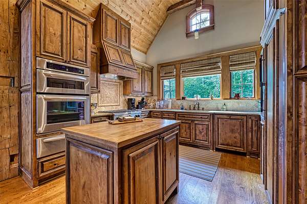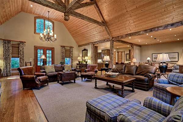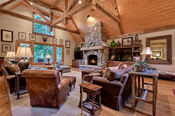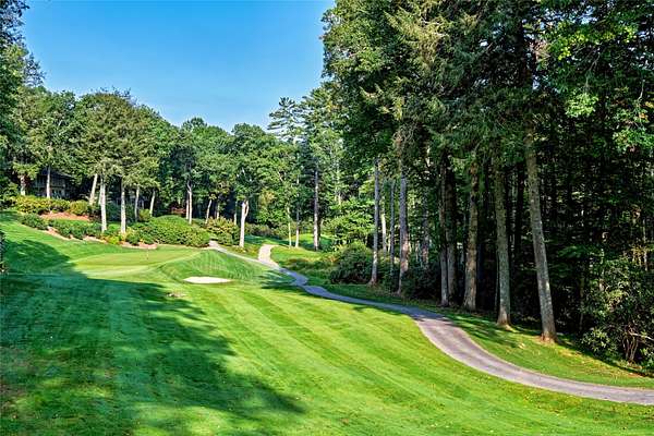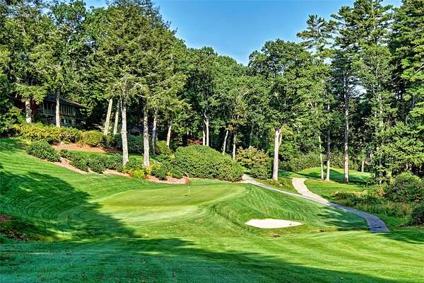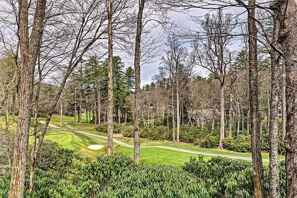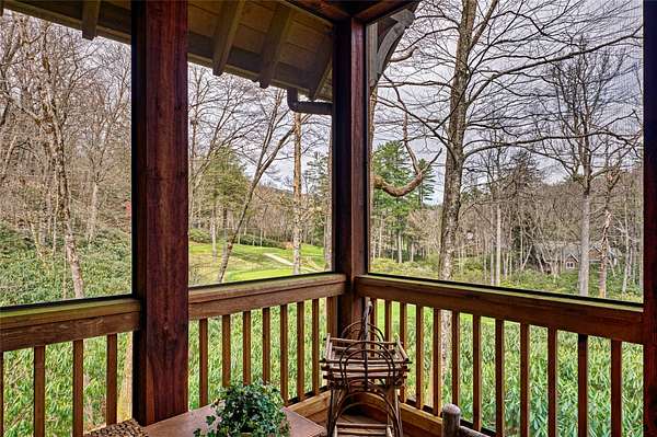 Privately situated in Highlands Country Club, overlooking the 14th, 15th, and 16th greens, this custom home offers beautiful landscaping, several small water features, a gated entrance, and outstanding views of the golf course. A dramatic entryway opens into the central living space that features a soaring wood and beam cathedral ceiling, hardwood floors, and a floor-to-ceiling stone fireplace. The home has four bedrooms: the master and an ensuite guest bedroom on the main floor; and upstairs, two ensuite bedrooms offer guests privacy and views of the property. A screened Carolina room with a stone fireplace opens off the dining area and the adjacent decks showcase the golf course. The gated drive has generous parking in front of the garage and there is golf cart storage behind the house. An adjacent lot is included in the sale of this property.