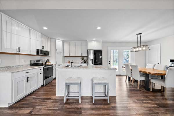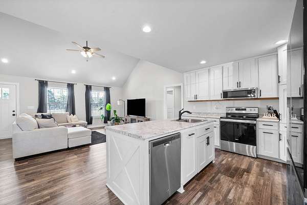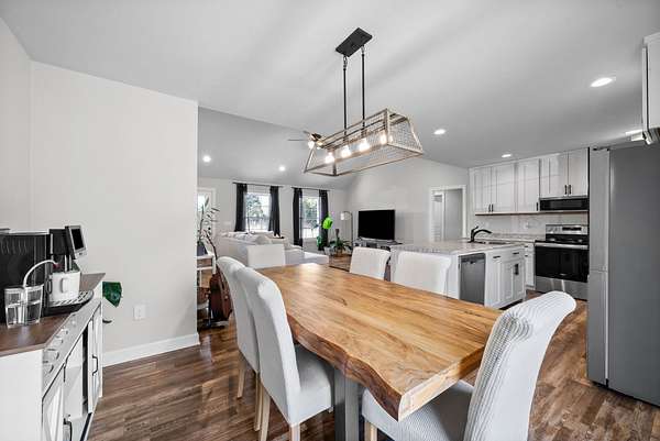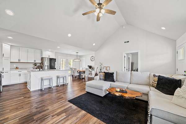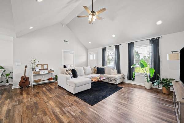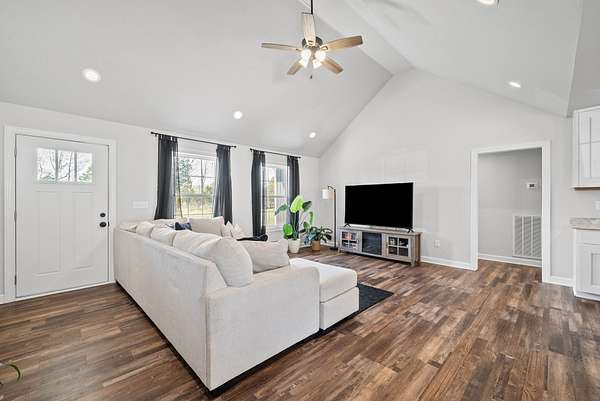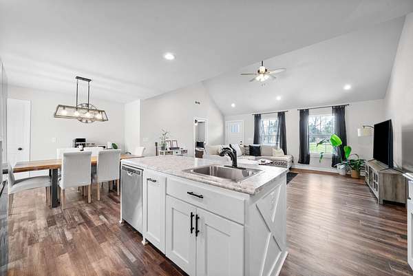 Beautiful 3-bedroom, 2-bathroom home featuring a spacious open layout and thoughtful design throughout. The kitchen includes an island with built-in sink, perfect for cooking, entertaining, and gatherings. The living room has a stunning vaulted ceiling, creating an open and airy feel. A convenient side entrance provides easy access directly into the utility room, making laundry and daily tasks more practical and efficient. Outside, the property offers attractive landscaping and a dedicated outdoor entertainment space, ideal for hosting gatherings, relaxing evenings, or weekend cookouts. This home combines comfort, functionality, and outdoor living — a must-see for anyone looking for both convenience and style.
