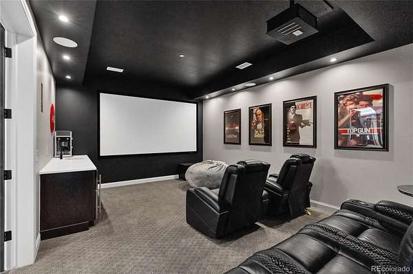 The walkout lower level is designed for entertaining with a custom theater, a statement bar with beverage fridge, wine cooler, dishwasher, beer taps, a wine room, bonus spaces, and an additional guest suite.