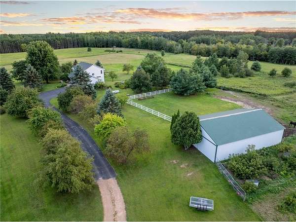 Pride of ownership shines throughout this beautiful property! Nestled on 18 private acres, you'll enjoy lush surroundings, abundant wildlife, and breathtaking 360? panoramic and lake views. The 1 acre lot across from the home site is actually 1 acre of lake shore property! A winding, tree-lined drive welcomes you home, framed by tall pines and flowering trees. Perfect for country living, the property offers a fenced pasture and a 40x56 wired pole building. You'll also find vegetable gardens, raspberry and strawberry patches, rhubarb, blueberries, along with apple and plum trees. Step inside and you will find a kitchen with a built-in wine fridge, granite counters, and a center island--flowing seamlessly into the great room with a cozy stone fireplace. Upstairs, three spacious bedrooms offer incredible views, with a freshly updated full bath. The ensuite retreat includes a private bath, walk-in closet, and sitting room overlooking the lake. Head down to the newly finished walk-out lower level where you will find a flex space, family room, and bathroom. Recent updates include: new windows and blinds (2025), new kitchen/dining/family room flooring, updated wiring in the pole barn (2023), new furnace (2023), new washer/dryer (2024), new stove (2024), and a convenient yard hydrant (2023). Enjoy the best of peaceful country living while still being close to town. With bird watching, wildlife, and nearby Springvale Park for horses and more, this is a truly special place to call home.