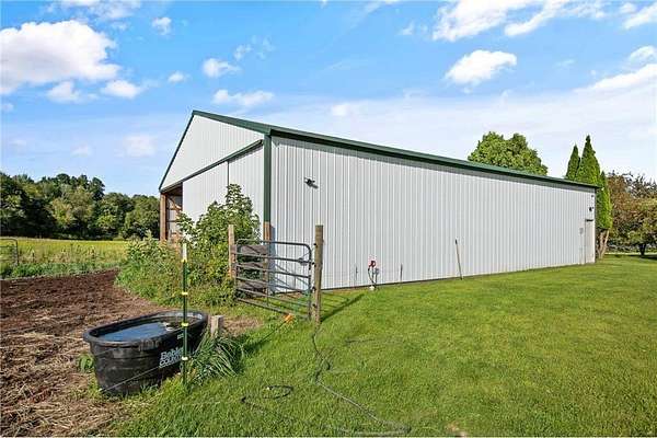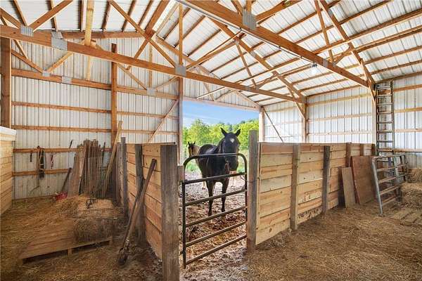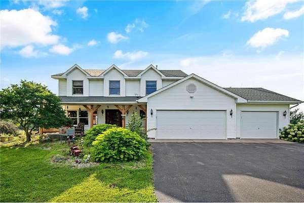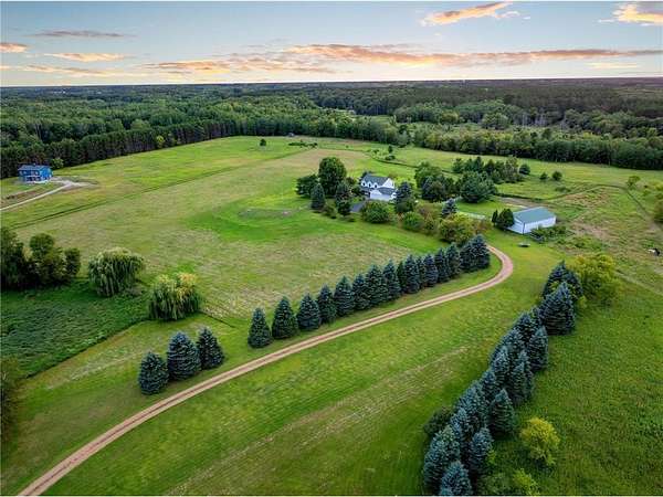 Pride of ownership shines throughout this beautiful property! Nestled on 18 private acres, you’ll enjoy lush surroundings, abundant wildlife, and breathtaking 360° panoramic and lake views. The 1 acre lot across from the home site is actually 1 acre of lake shore property! A winding, tree-lined drive welcomes you home, framed by tall pines and flowering trees. Perfect for country living, the property offers a fenced pasture and a 40x56 wired pole building. You’ll also find vegetable gardens, raspberry and strawberry patches, rhubarb, blueberries, along with apple and plum trees. Step inside and you will find a kitchen with a built-in wine fridge, granite counters, and a center island—flowing seamlessly into the great room with a cozy stone fireplace. Upstairs, three spacious bedrooms offer incredible views, with a freshly updated full bath. The ensuite retreat includes a private bath, walk-in closet, and sitting room overlooking the lake. Head down to the newly finished walk-out lower level where you will find a flex space, family room, and bathroom. Recent updates include: new windows and blinds (2025), new kitchen/dining/family room flooring, updated wiring in the pole barn (2023), new furnace (2023), new washer/dryer (2024), new stove (2024), and a convenient yard hydrant (2023). Enjoy the best of peaceful country living while still being close to town. With bird watching, wildlife, and nearby Springvale Park for horses and more, this is a truly special place to call home.