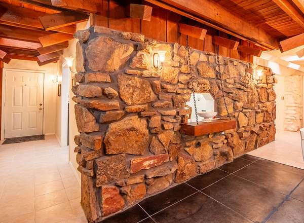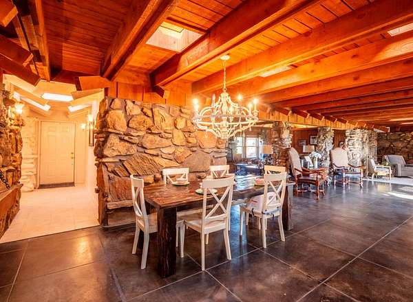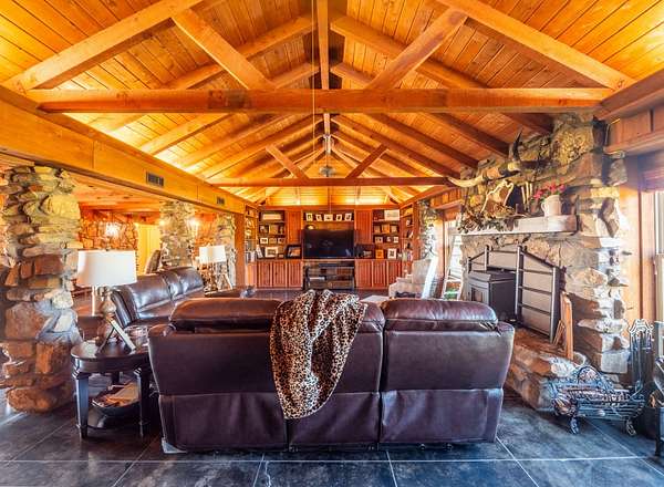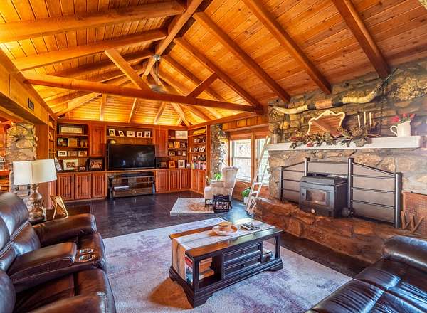 Home- This ranch style home is truly unique and boasts 5 bedrooms and 4 baths and offers privacy, but is still close to town. The great room is highlighted with native rock from the area and rustic beam ceilings that remind you of a scene out of Yellowstone. The kitchen has been updated and the home is extremely spacious. All bedrooms are downstairs in this one level home.