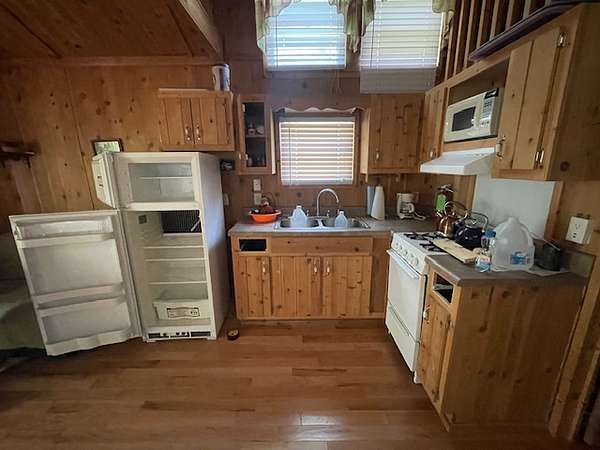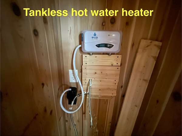 The home is fully wired and has instantaneous hot water heater, full kitchen with propane cookstove and even an air conditioning unit. A standard septic system has already been installed. There is no well but you can do rain catchment or get creative and put a "ram pump" on the outflow from the cave.