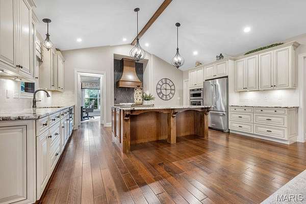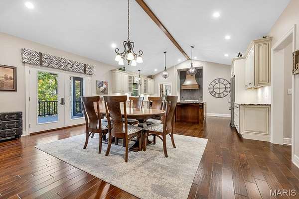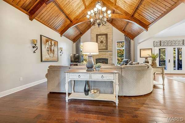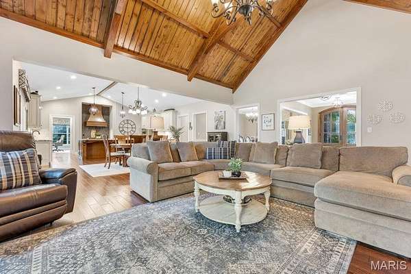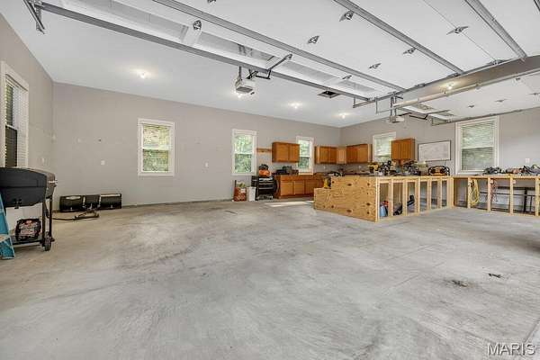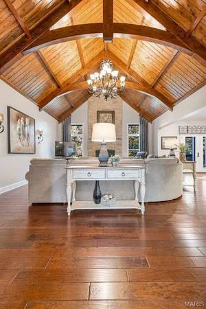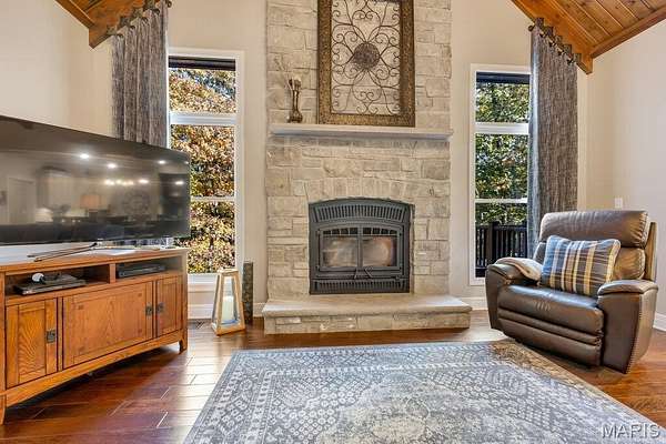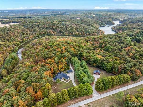 Experience the ultimate in privacy and natural beauty with this stunning custom waterfront property nestled on 37+ mostly wooded acres fronting the serene waters of Callaway Valley Lake. Crafted with exceptional attention to detail, this one-of-a-kind property showcases rich woodwork and impeccable craftsmanship throughout. Highlighted by a grand wood-paneled ceiling with softly arched beams, and a floor to ceiling stone fireplace that lend warmth and architectural elegance to the main living space. At the heart of the home lies an open, elegant luxury kitchen that is sure to impress with custom cabinetry, premium appliances, and generous prep space, making it ideal for both everyday living and entertaining in style. Hop in the side by side and head to the lake to enjoy your own private boat dock, perfect for fishing, kayaking, sunset cruises, or simply soaking in the peaceful lakeside setting. This land is ideal for hunting, hiking, and exploring, offering year-round outdoor adventure in your own backyard. Additional features include a total of 7 garage spaces, a versatile detached 3 car garage, a large chicken coop, and charming Barn with loft space and concrete floors adding both functionality and character to this exceptional property. All of this is set within a peaceful, wooded landscape that feels worlds away--yet is just minutes from New Melle, Wentzville and Defiance, Missouri. ATTN: Option to purchase just the home on 5 acres with detached garage and chicken coop or just 32+/- acres with the lake frontage, dock and barn Available!! Both options include Lake Rights!