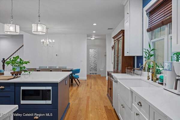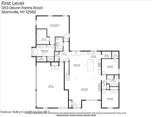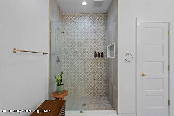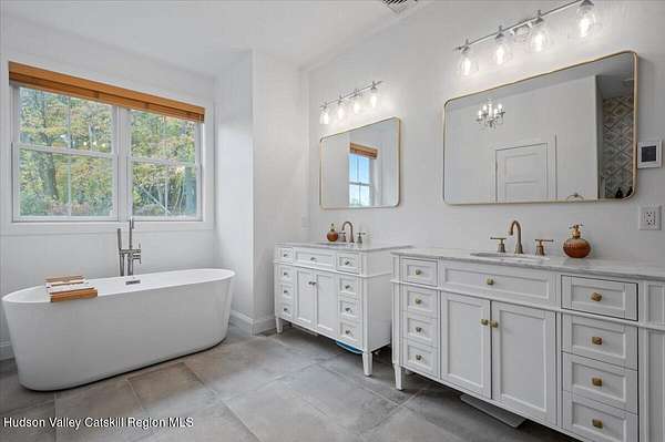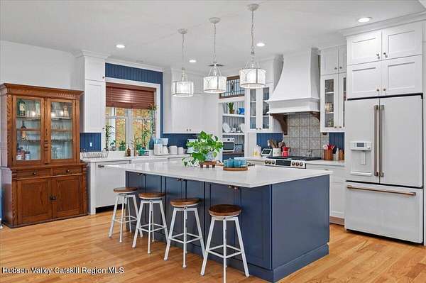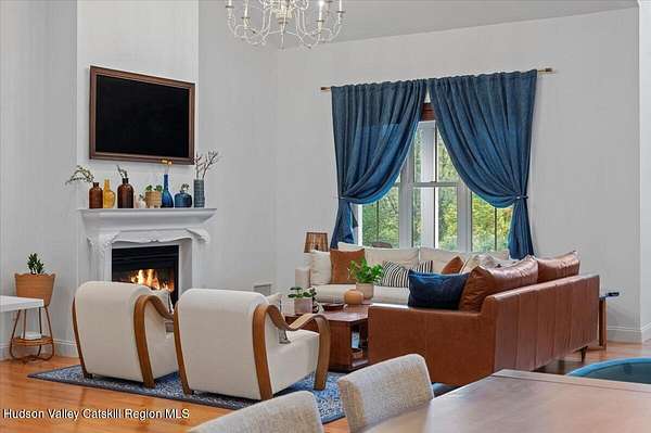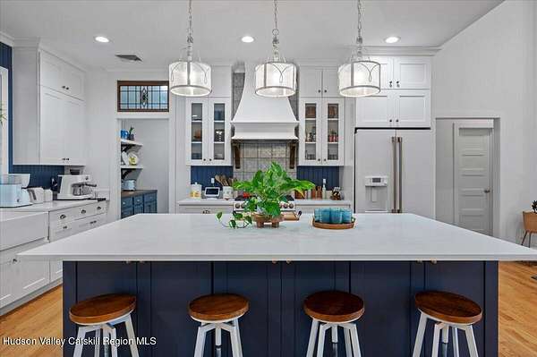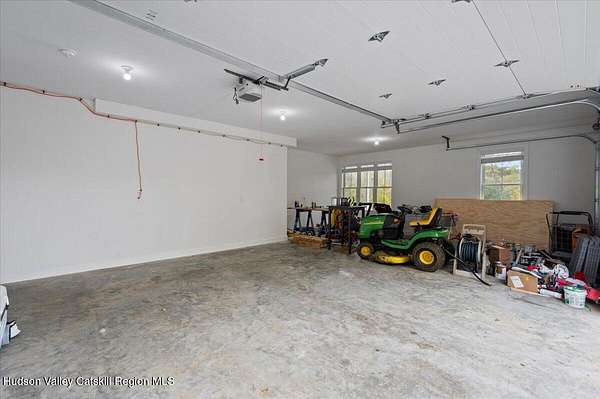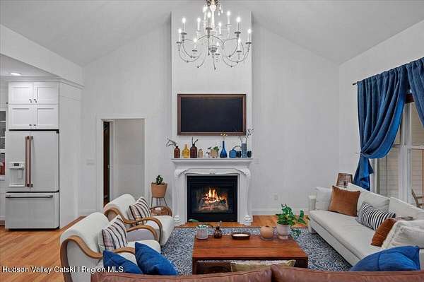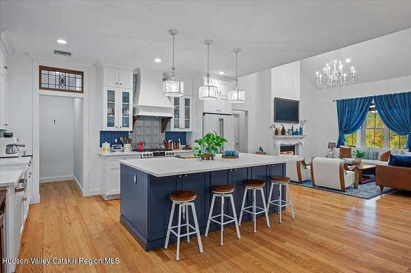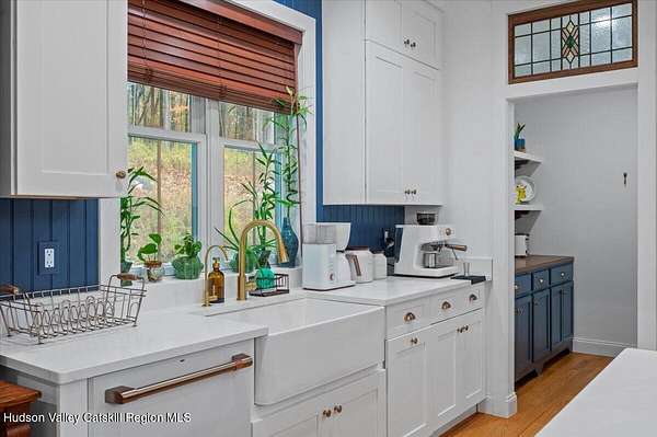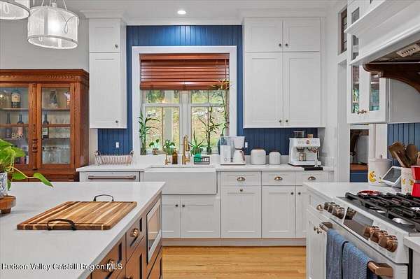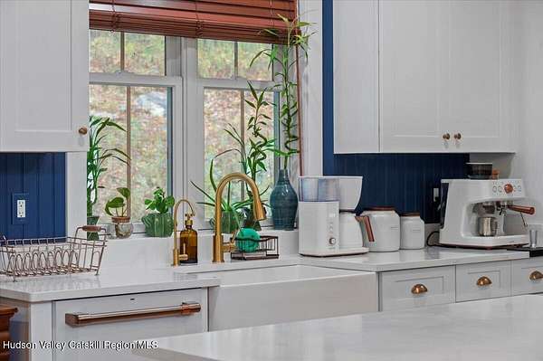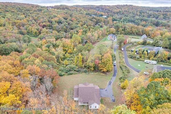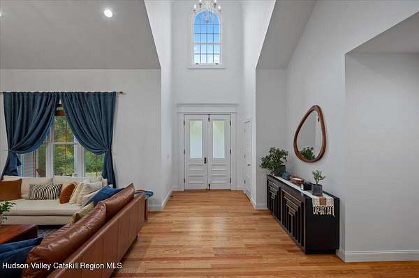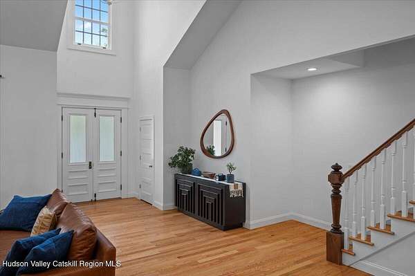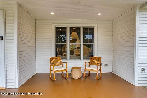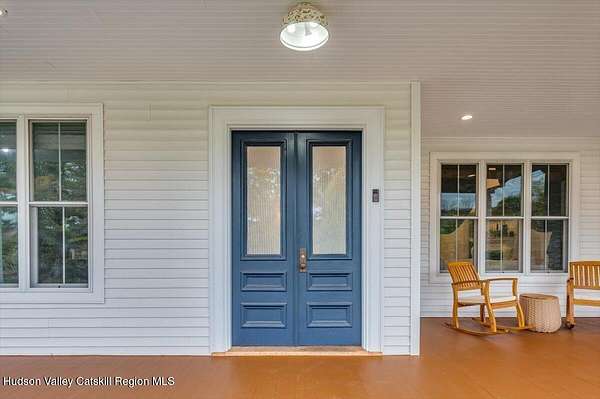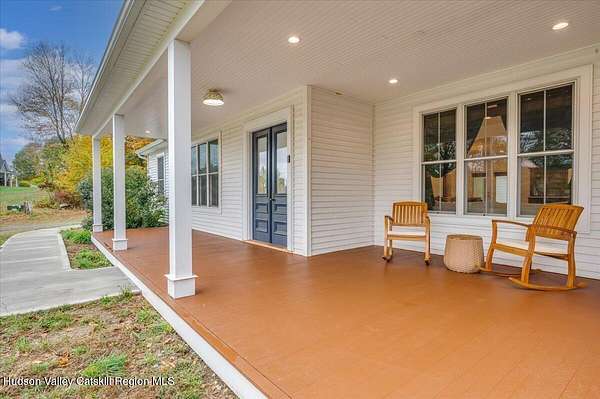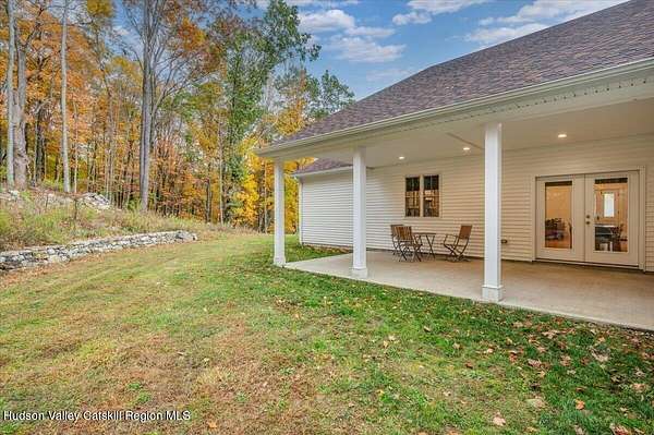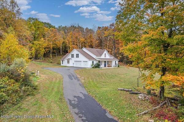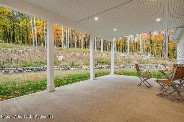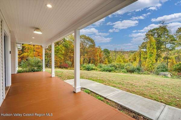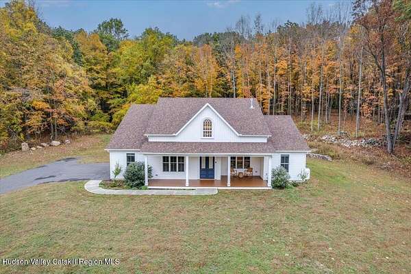 A Timeless Farmhouse Retreat with Modern Elegance. Step into refined country living with this brand-new, bespoke farmhouse ranch, where Old World charm meets contemporary craftsmanship. Gracefully set on over five private, serene acres, this four-bedroom, three-and-a-half-bath home invites you to savor a lifestyle of quiet sophistication and natural beauty. A dramatic 20-foot entryway ceiling welcomes you with an antique stained-glass window, setting the tone for a home where curated history and modern comfort intertwine. Wide-plank hardwood floors, soaring 9-foot ceilings, and sun-drenched Anderson windows carry you through a light-filled open floor plan, designed for effortless entertaining and everyday elegance. The heart of the home is a chef's kitchen, beautifully appointed with quartz countertops, Cafe series appliances, a farmhouse sink, and a custom range hood. An antique hutch and a walk-in pantry with custom cabinetry offer both charm and function, while French doors in the dining area lead to a covered patio-ideal for al fresco gatherings. The living room is anchored by a gas fireplace with a hand-hewn antique wood mantel and exposed beam, creating a warm, inviting ambiance. A refined powder room, mudroom with garage access, and an oversized laundry suite with built-in storage elevate everyday living. The primary suite is a true sanctuary, featuring a vaulted ceiling, private access to the patio, a custom walk-in closet, and a luxurious spa bath with a freestanding soaking tub, walk-in shower, water closet, and heated floors. Two additional bedrooms and a full bath complete the main level. Upstairs, a spacious media room leads to a fourth bedroom with a walk-in closet and a private en-suite bath-ideal for guests or an au pair suite. Thoughtful details abound: Therma-Tru doors, foam insulation, on-demand hot water, and antique accents throughout. The home also features a three-car attached garage and a wide front porch with Douglas Fir decking, perfect for morning coffee or evening sunsets. Ideally located with convenient access to I-84, Taconic State Parkway, and the Metro-North train, this exceptional residence offers country living with seamless connectivity. Brand new Tesla electric car charger installed. Many home essentials are still covered under the new-build warranty.