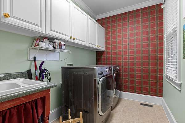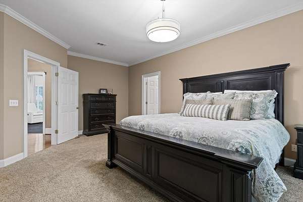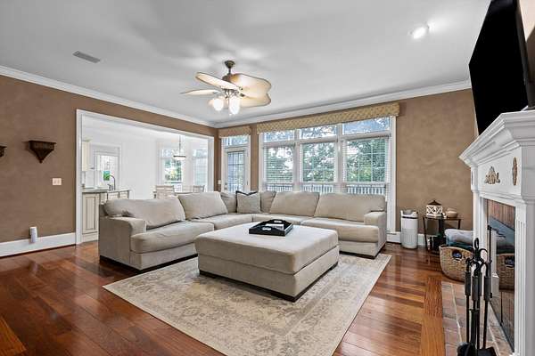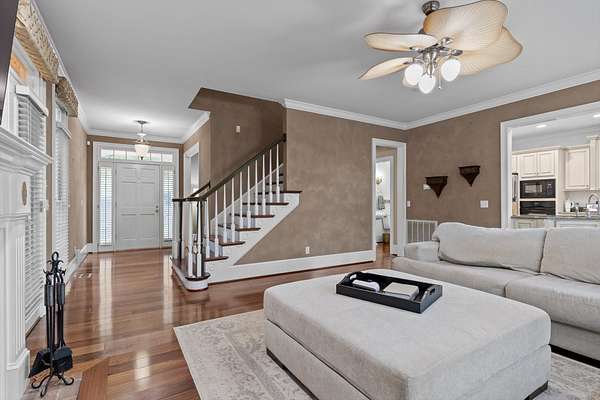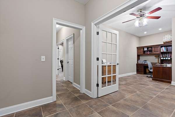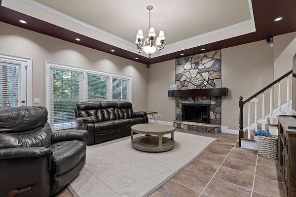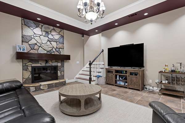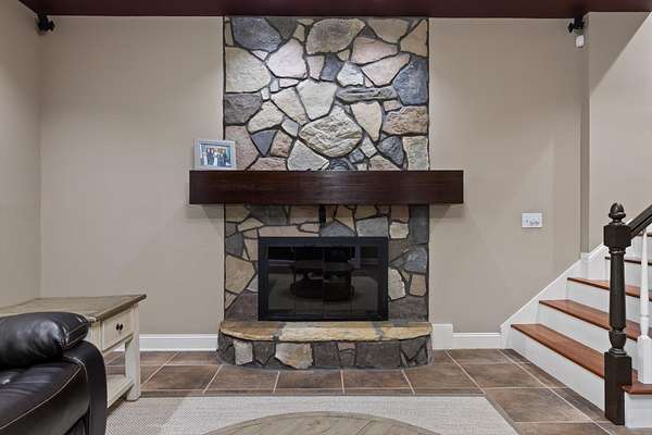 Upstairs, the expansive primary suite features dual closets, a soaking tub, tiled shower, and double vanities. Four additional bedrooms offer large closets and plenty of natural light. The fully finished basement is a dream for multi-generational living or older kids, with its own den and fireplace, dedicated office, fifth bedroom, full bathroom, and walk-out patio access. Two oversized storage rooms provide ideal space for lawn equipment, tools, or a workshop.