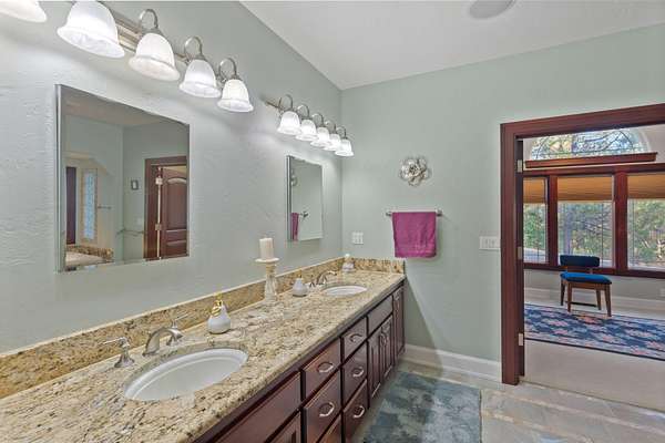 - Breakfast Bar, Built-In Features, Ceiling Fan(s), Double Vanity, Enclosed Toilet(s), Fiberglass Stall Shower, Granite Counters, Kitchen Island, Laminate Counters, Linen Closet, Pantry, Primary Downstairs, Shower/Tub Combo, Soaking Tub, Tile Shower, Vaulted Ceiling(s), Walk-In Closet(s)