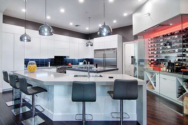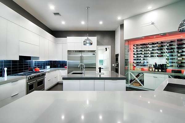 The huge kitchen family room area has dinner seating for fifteen. The spectacular kitchens contains a glass walled, humidity and temperature controlled wine room. There are two large Viking refrigerators, a large Viking range, a Thermador oven, microwave and warming drawer, two Sub Zero refrigerator drawers, and 4 Fisher Paykel dishwasher drawers.