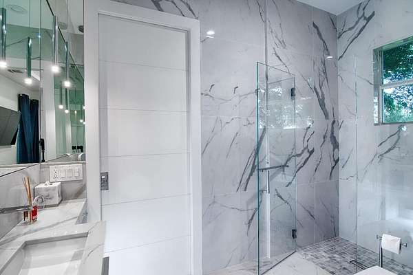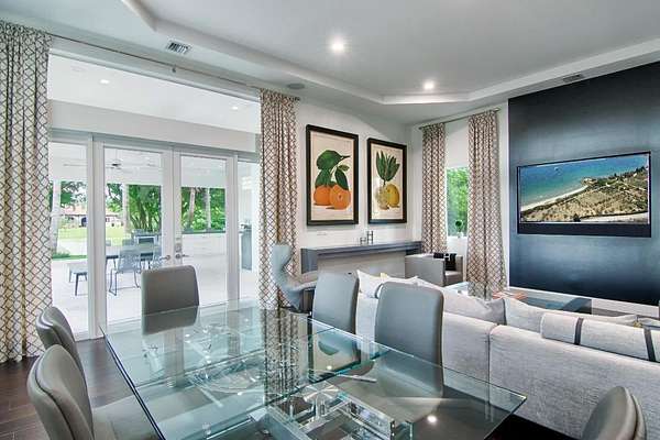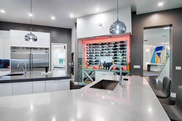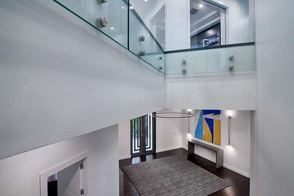 Custom made 10 feet tall steel entry doors invite you into a grand entrance gallery with dual staircases and floor to ceiling views of the stunning pool area that will have guests lounging outdoors until long after the sun sets. The resort like pool area contains a bath with a sauna and steam shower. The surrounding outdoor kitchen is in a covered area with seating for 15. Or seek refuge in front of the fireplace in the tiki hut and watch a movie. Climb a 15 foot high rock formation and enter the water slide that shoots you into the pool. Then swim into the hidden grotto or over to the in-water bar stools and be served a refreshing drink from the sunken bar.